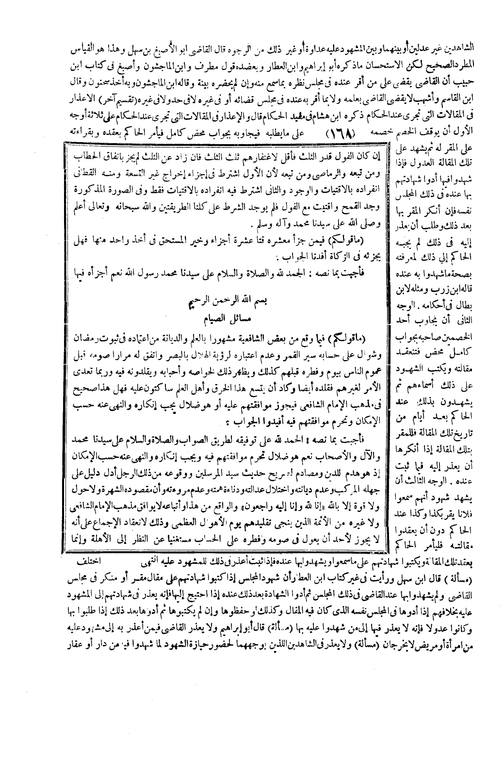 بِسْمِ اللَّهِ الرَّحْمَنِ الرَّحِيمِ مَسَائِلُ الصِّيَامِ (مَا قَوْلُكُمْ) : فِيمَا وَقَعَ مِنْ بَعْضِ الشَّافِعِيَّةِ مَشْهُورًا بِالْعِلْمِ، وَالدِّيَانَةِ مِنْ اعْتِمَادِهِ فِي ثُبُوتِ رَمَضَانَ، وَشَوَّالَ عَلَى حِسَابِهِ سَيْرَ الْقَمَرِ، وَعَدَمِ اعْتِبَارِهِ لِرُؤْيَةِ الْهِلَالِ بِالْبَصَرِ، وَاتَّفَقَ لَهُ مِرَارًا صَوْمُهُ قَبْلَ عُمُومِ النَّاسِ بِيَوْمٍ، وَفِطْرُهُ قَبْلَهُمْ كَذَلِكَ، وَيُظْهِرُ ذَلِكَ لِخَوَاصِّهِ، وَأَحْبَابِهِ، وَيُقَلِّدُونَهُ فِيهِ، وَرُبَّمَا تَعَدَّى الْأَمْرُ لِغَيْرِهِمْ فَقَلَّدَهُ أَيْضًا، وَكَادَ أَنْ يَتَّسِعَ هَذَا الْخَرَقُ، وَأَهْلُ الْعِلْمِ سَاكِتُونَ عَلَيْهِ فَهَلْ هَذَا صَحِيحٌ فِي مَذْهَبِ الْإِمَامِ الشَّافِعِيِّ فَيَجُوزُ مُوَافَقَتُهُمْ عَلَيْهِ أَوْ هُوَ ضَلَالٌ يَجِبُ إنْكَارُهُ، وَالنَّهْيُ عَنْهُ حَسَبِ الْإِمْكَانِ، وَتَحْرُمُ مُوَافَقَتُهُمْ فِيهِ أَفِيدُوا الْجَوَابَ؟