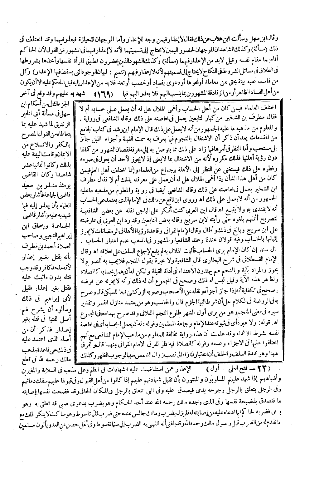قَالَ ابْنُ الْعَرَبِيِّ كُنْت أُنْكِرُ عَلَى الْبَاجِيِّ نَقْلَهُ عَنْ بَعْضِ الشَّافِعِيَّةِ لِتَصْرِيحِ أَئِمَّتِهِمْ بِلَغْوِهِ حَتَّى رَأَيْتُهُ لِابْنِ سُرَيْجٍ، وَقَالَهُ بَعْضُ التَّابِعِينَ، وَقَدْ رَدَّ ابْنُ الْعَرَبِيِّ فِي عَارِضَتِهِ عَلَى ابْنِ سُرَيْجٍ، وَبَالَغَ فِي ذَلِكَ، وَأَطَالَ، وَقَالَ الْإِمَامُ الْقَرَافِيُّ، وَقَاعِدَةُ رُؤْيَةِ الْأَهِلَّةِ فِي الرَّمَضَانَاتِ لَا يَجُوزُ إثْبَاتُهَا بِالْحِسَابِ، وَفِيهِ قَوْلَانِ عِنْدَنَا، وَعِنْدَ الشَّافِعِيَّة