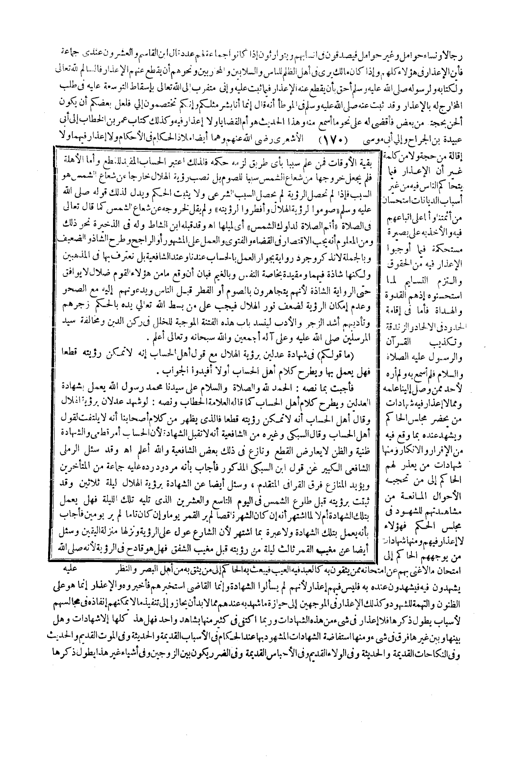 وَقَدْ قَبِلَهُ ابْنُ الشَّاطِّ، وَلَهُ فِي الذَّخِيرَةِ نَحْوُ ذَلِكَ، وَمِنْ الْمَعْلُومِ أَنَّهُ يَجِبُ الِاقْتِصَارُ فِي الْقَضَاءِ، وَالْفَتْوَى، وَالْعَمَلِ عَلَى الْمَشْهُورِ أَوْ الرَّاجِحِ، وَطَرْحِ الشَّاذِّ، وَالضَّعِيفِ، وَبِالْجُمْلَةِ لَا نَذْكُرُ وُجُودَ رِوَايَةٍ بِجِوَارِ الْعَمَلِ بِالْحِسَابِ عِنْدَنَا، وَعِنْدَ الشَّافِعِيَّة بَلْ نَعْتَرِفُ بِهَا فِي الْمَذْهَبَيْنِ، وَلَكِنَّهَا شَاذَّةٌ فِيهِمَا، وَمُقَيَّدَةٌ بِخَاصَّةِ النَّفْسِ، وَبِالْغَيْمِ فَبَانَ أَنَّ مَا وَقَعَ مِنْ هَؤُلَاءِ الْقَوْمِ ضَلَالٌ لَا يُوَافِقُ حَتَّى الرِّوَايَةَ الشَّاذَّةَ؛ لِأَنَّهُمْ يَتَجَاهَرُونَ بِالصَّوْمِ أَوْ الْفِطْرِ قَبْلَ النَّاسِ، وَيَدْعُونَهُمْ إلَيْهِ مَعَ الصَّحْوِ، وَعَدَمِ إمْكَانِ الرُّؤْيَةِ لِضَعْفِ نُورِ الْهِلَالِ فَيَجِبُ عَلَى مَنْ بَسَطَ اللَّهُ تَعَالَى يَدَهُ بِالْحُكْمِ زَجْرُهُمْ، وَتَأْدِيبُهُمْ أَشَدَّ الزَّجْرِ، وَالْأَدَبِ لِيَنْسَدَّ بَابُ هَذِهِ الْفِتْنَةِ الْمُوجِبَةِ لِلْخَلَلِ فِي رُكْنِ الدِّينِ، وَمُخَالَفَةِ سَيِّدِ الْمُرْسَلِينَ صَلَّى اللَّهُ عَلَيْهِ، وَعَلَى آلِهِ أَجْمَعِينَ، وَاَللَّهُ سُبْحَانَهُ وَتَعَالَى أَعْلَمُ.