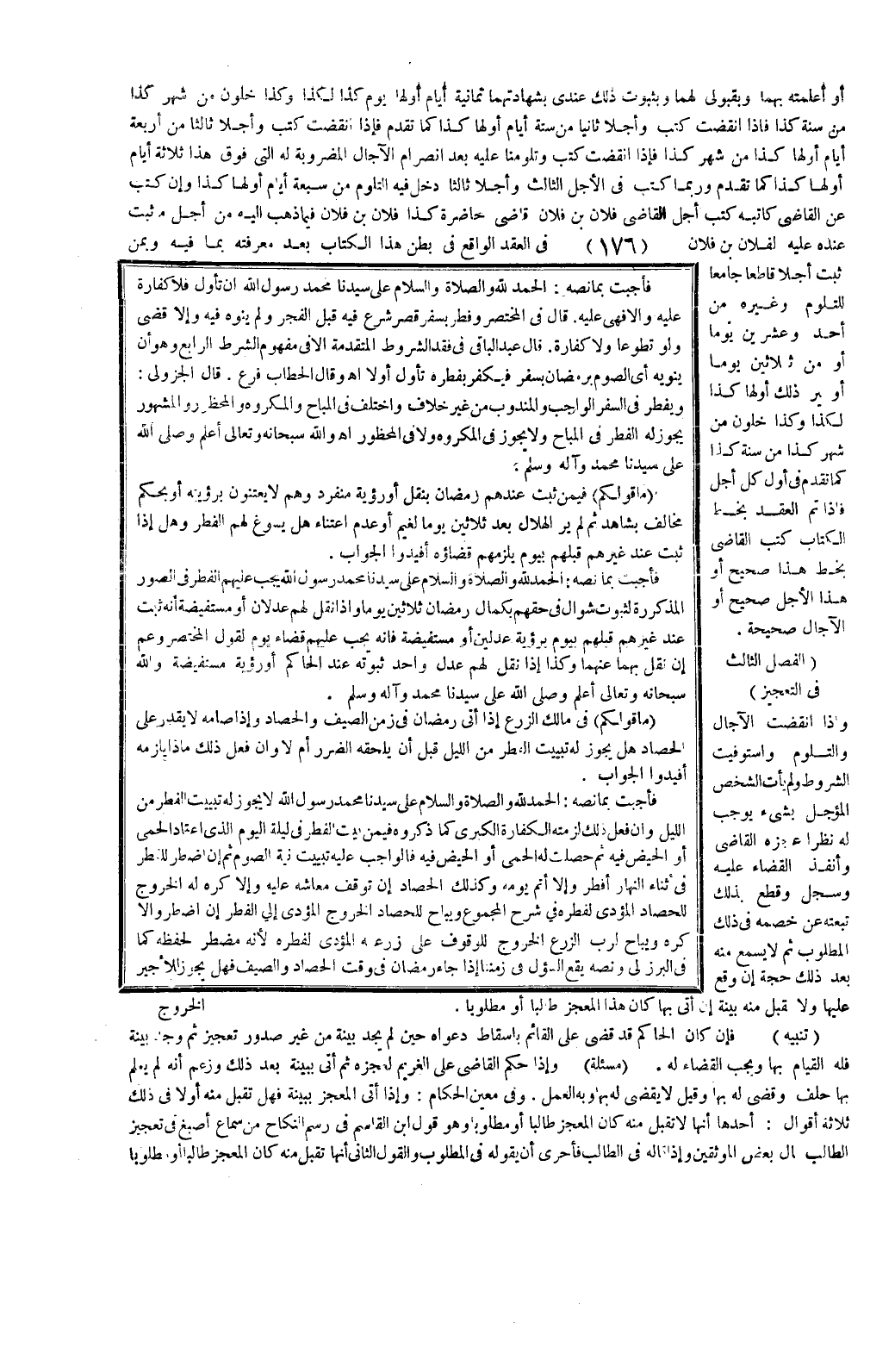 فَأَجَبْتُ بِمَا نَصُّهُ: الْحَمْدُ لِلَّهِ، وَالصَّلَاةُ، وَالسَّلَامُ عَلَى سَيِّدِنَا مُحَمَّدٍ رَسُولِ اللَّهِ يَجِبُ عَلَيْهِمْ الْفِطْرُ فِي الصُّوَرِ الْمَذْكُورَةِ لِثُبُوتِ شَوَّالَ فِي حَقِّهِمْ بِكَمَالِ رَمَضَانَ ثَلَاثِينَ يَوْمًا، وَإِذَا نَقَلَ لَهُمْ عَدْلَانِ أَوْ مُسْتَفِيضَةٌ أَنَّهُ ثَبَتَ عِنْدَ غَيْرِهِمْ قَبْلَهُمْ بِيَوْمٍ بِرُؤْيَةِ عَدْلَيْنِ أَوْ مُسْتَفِيضَةٍ فَإِنَّهُ يَجِبُ عَلَيْهِمْ قَضَاءُ يَوْمٍ لِقَوْلِ الْمُخْتَصَرِ، وَعَمَّ إنْ نُقِلَ بِهِمَا عَنْهُمَا، وَكَذَا إذَا نَقَلَ لَهُمْ عَدْلٌ وَاحِدٌ ثُبُوتَهُ عِنْدَ الْحَاكِمِ أَوْ رُؤْيَةً مُسْتَفِيضَةً، وَاَللَّهُ سُبْحَانَهُ، وَتَعَالَى أَعْلَمُ، وَصَلَّى اللَّهُ عَلَى سَيِّدِنَا مُحَمَّدٍ وَآلِهِ وَسَلَّمَ.