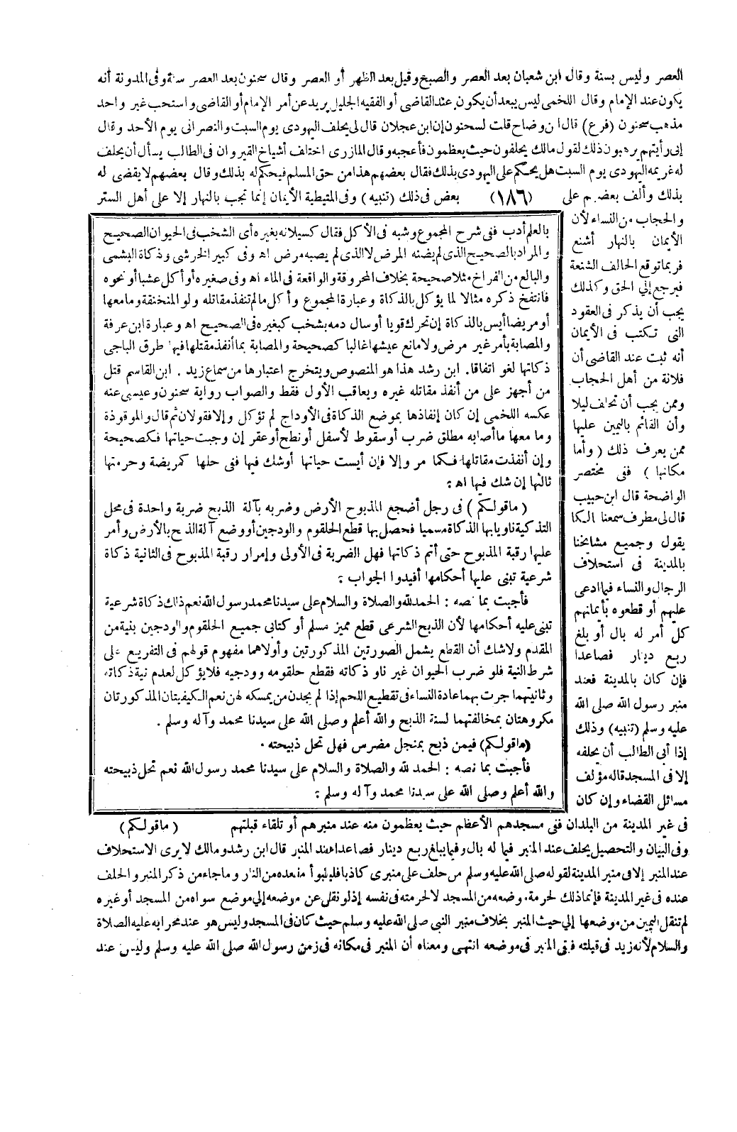 فَأَجَبْتُ بِمَا نَصُّهُ: الْحَمْدُ لِلَّهِ، وَالصَّلَاةُ، وَالسَّلَامُ عَلَى سَيِّدِنَا مُحَمَّدٍ رَسُولِ اللَّهِ نَعَمْ ذَلِكَ ذَكَاةٌ شَرْعِيَّةٌ تُبْنَى عَلَيْهِ أَحْكَامُهَا؛ لِأَنَّ الذَّبْحَ الشَّرْعِيَّ قَطْعُ مُمَيِّزٍ مُسْلِمٍ أَوْ كِتَابِيٍّ جَمِيعَ الْحُلْقُومِ، وَالْوَدَجَيْنِ بِنِيَّةٍ مِنْ الْمُقَدَّمِ، وَلَا شَكَّ أَنَّ الْقَطْعَ يَشْمَلُ الصُّورَتَيْنِ الْمَذْكُورَتَيْنِ، وَأُولَاهُمَا مَفْهُومُ قَوْلِهِمْ فِي التَّفْرِيعِ عَلَى شَرْطِ النِّيَّةِ فَلَوْ ضَرَبَ الْحَيَوَانَ غَيْرَ نَاوٍ ذَكَاتَهُ فَقَطَعَ حُلْقُومَهُ، وَوَدَجَيْهِ فَلَا يُؤْكَلُ لِعَدَمِ نِيَّةِ ذَكَاتِهِ، وَثَانِيَتُهَا جَرَتْ بِهِمَا عَادَةُ النِّسَاءِ فِي تَقْطِيعِ اللَّحْمِ إذَا لَمْ يَجِدْنَ مَنْ يُمْسِكُهُ لَهُنَّ نَعَمْ الْكَيْفِيَّتَانِ الْمَذْكُورَتَانِ مَكْرُوهَتَانِ بِمُخَالَفَتِهِمَا لِسُنَّةِ الذَّبْحِ، وَاَللَّهُ أَعْلَمُ، وَصَلَّى اللَّهُ عَلَى سَيِّدِنَا مُحَمَّدٍ وَآلِهِ وَسَلَّمَ.