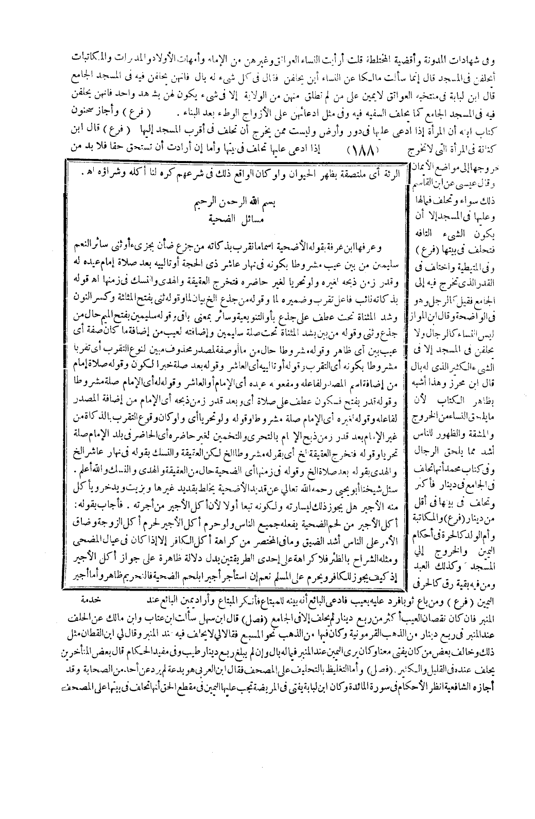 بِسْمِ اللَّهِ الرَّحْمَنِ الرَّحِيمِ مَسَائِلُ الضَّحِيَّةِ وَعَرَّفَهَا ابْنُ عَرَفَةَ بِقَوْلِهِ الْأُضْحِيَّةُ اسْمًا مَا تُقُرِّبَ بِذَكَاتِهِ مِنْ جَزْعِ ضَأْنٍ يُجْزِئُ أَوْ ثَنِيِّ سَائِرِ النَّعَمِ سَلِيمَيْنِ مِنْ بَيِّنِ عَيْبٍ مَشْرُوطًا بِكَوْنِهِ فِي نَهَارِ عَاشِرِ ذِي الْحِجَّةِ أَوْ تَالِيَيْهِ بَعْدَ صَلَاةِ إمَامِ عِيدِهِ لَهُ وَقَدْرِ زَمَنِ ذَبْحِهِ لِغَيْرِهِ، وَلَوْ تَحَرِّيًا لِغَيْرِ حَاضِرِهِ فَتَخْرُجُ الْعَقِيقَةُ، وَالْهَدْيُ، وَالنُّسُكُ فِي زَمَنِهَا اهـ. قَوْلُهُ بِذَكَاتِهِ نَائِبُ فَاعِلِ تُقَرِّبَ، وَضَمِيرُهُ لِمَا وَقَوْلُهُ مِنْ جَذَعٍ إلَخْ بَيَانُ لِمَا وَقَوْلُهُ ثَنِيِّ بِفَتْحِ الْمُثَلَّثَةِ، وَكَسْرِ النُّونِ، وَشَدِّ الْمُثَنَّاةِ تَحْتٌ عَطْفٌ عَلَى جَذَعٍ بِأَوْ التَّنْوِيعِيَّةِ، وَسَائِرُ بِمَعْنَى بَاقِي وَقَوْلُهُ سَلِيمَيْنِ بِفَتْحِ الْمِيمِ حَالٌ مِنْ جَذَعٍ، وَثَنِيٍّ وَقَوْلُهُ مِنْ بَيِّنٍ بِشَدِّ الْمُثَنَّاةِ تَحْتٌ صِلَةُ سَلِيمَيْنِ، وَإِضَافَتُهُ لِعَيْبٍ مِنْ إضَافَةِ مَا كَانَ صِفَةً أَيْ عَيْبٌ بَيِّنٌ أَيْ ظَاهِرٌ وَقَوْلُهُ مَشْرُوطًا حَالٌ مِنْ مَا أَوْ صِفَةٌ لِمَصْدَرٍ مَحْذُوفٍ مُبَيِّنٌ لِنَوْعِ التَّقَرُّبِ أَيْ تَقَرُّبًا مَشْرُوطًا بِكَوْنِهِ أَيْ التَّقَرُّبِ وَقَوْلُهُ أَوْ تَالِيَيْهِ أَيْ الْعَاشِرُ وَقَوْلُهُ بَعْدَ صِلَةٍ خَبَرًا لِكَوْنِ وَقَوْلُهُ صَلَاةُ إمَامٍ مِنْ إضَافَةِ اسْمِ الْمَصْدَر لِفَاعِلِهِ، وَمَفْعُولُهُ عِيدَهُ أَيْ الْإِمَامُ أَوْ الْعَاشِرُ وَقَوْلُهُ لَهُ أَيْ الْإِمَامِ صِلَةُ مَشْرُوطًا وَقَوْلُهُ قَدْرٌ بِفَتْحٍ فَسُكُونٍ عَطْفٌ عَلَى صَلَاةٍ أَيْ، وَبَعْدَ قَدْرِ زَمَنِ ذَبْحِهِ أَيْ الْإِمَامِ مِنْ إضَافَةِ الْمَصْدَرِ لِفَاعِلِهِ وَقَوْلُهُ لِغَيْرِهِ أَيْ الْإِمَامِ صِلَةُ مَشْرُوطًا وَقَوْلُهُ، وَلَوْ تَحَرِّيًا أَيْ، وَلَوْ كَانَ وُقُوعُ التَّقَرُّبِ بِالذَّكَاةِ مِنْ غَيْرِ الْإِمَامِ بَعْدَ قَدْرِ زَمَنِ ذَبْحِ الْإِمَامِ بِالتَّحَرِّي، وَالتَّخْمِينِ لِغَيْرِ حَاضِرِهِ أَيْ الْحَاضِرِ فِي بَلَدِ الْإِمَامِ صِلَةُ تَحَرِّيًا وَقَوْلُهُ فَتَخْرُجُ الْعَقِيقَةُ إلَخْ أَيْ بِقَوْلِهِ مَشْرُوطًا إلَخْ لَكِنَّ الْعَقِيقَةَ، وَالنُّسُكَ بِقَوْلِهِ فِي نَهَارِ عَاشِرِ إلَخْ، وَالْهَدْيُ بِقَوْلِهِ بَعْدَ صَلَاةِ إلَخْ وَقَوْلُهُ فِي زَمَنِهَا أَيْ الضَّحِيَّةِ حَالٌ مِنْ الْعَقِيقَةِ، وَالْهَدْيِ، وَالنُّسُكِ، وَاَللَّهُ أَعْلَمُ. سُئِلَ شَيْخُنَا أَبُو يَحْيَى - رَحِمَهُ اللَّهُ تَعَالَى - عَنْ قَدِيدِ الْأُضْحِيَّةِ يُخْلَطُ بِقَدِيدِ غَيْرِهَا، وَبِزَيْتٍ، وَيُدَّخَرُ، وَيَأْكُلُ مِنْهُ الْأَجِيرُ هَلْ يَجُوزُ ذَلِكَ لِيَسَارَتِهِ، وَلِكَوْنِهِ تَبَعًا أَوْ لَا؛ لِأَنَّ أَكْلَ الْأَجِيرِ مِنْ أُجْرَتِهِ؟ .