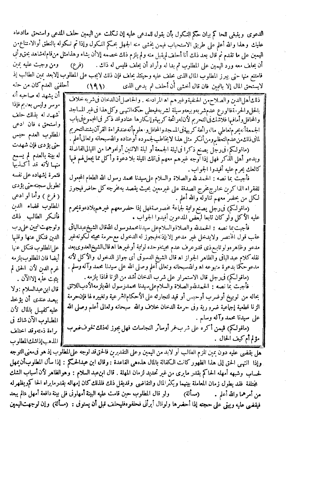 فَأَجَبْتُ بِمَا نَصُّهُ: الْحَمْدُ لِلَّهِ، وَالصَّلَاةُ، وَالسَّلَامُ عَلَى سَيِّدِنَا مُحَمَّدٍ رَسُولِ اللَّهِ يَلْزَمُهُ الْأَدَبُ اللَّائِقُ بِحَالِهِ مِنْ تَوْبِيخٍ أَوْ ضَرْبٍ أَوْ حَبْسٍ أَوْ قَيْدٍ لِتَجَرُّئِهِ عَلَى الْأَحْكَامِ الشَّرْعِيَّةِ، وَتَغْيِيرِهِ لَهَا فَإِنَّ حُرْمَةَ الزِّنَا قَطْعِيَّةٌ إجْمَاعِيَّةٌ ضَرُورِيَّةٌ، وَفِي حُرْمَةِ الدُّخَانِ خِلَافٌ، وَاَللَّهُ سُبْحَانَهُ، وَتَعَالَى أَعْلَمُ، وَصَلَّى اللَّهُ عَلَى سَيِّدِنَا مُحَمَّدٍ وَآلِهِ وَسَلَّمَ.