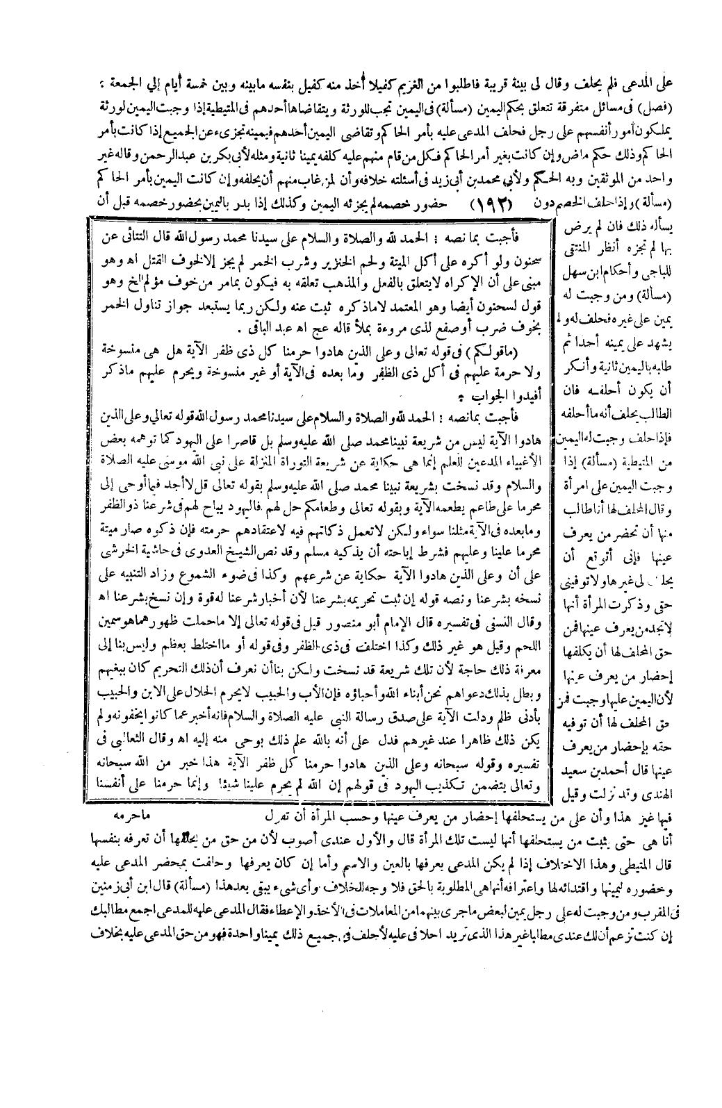 فَأَجَبْتُ بِمَا نَصُّهُ: الْحَمْدُ لِلَّهِ، وَالصَّلَاةُ، وَالسَّلَامُ عَلَى سَيِّدِنَا مُحَمَّدٍ رَسُولِ اللَّهِ قَوْله تَعَالَى {وَعَلَى الَّذِينَ هَادُوا} [الأنعام: 146] الْآيَةَ لَيْسَ مِنْ شَرِيعَةِ نَبِيِّنَا مُحَمَّدٍ - صَلَّى اللَّهُ عَلَيْهِ وَسَلَّمَ - بَلْ قَاصِرٌ عَلَى الْيَهُودِ كَمَا تَوَهَّمَهُ بَعْضُ الْأَغْبِيَاءِ الْمُدَّعِينَ لِلْعِلْمِ إنَّمَا هِيَ حِكَايَةٌ عَنْ شَرِيعَةِ التَّوْرَاةِ الْمُنَزَّلَةِ عَلَى نَبِيِّ اللَّهِ مُوسَى - عَلَيْهِ الصَّلَاةُ وَالسَّلَامُ - وَقَدْ نُسِخَتْ بِشَرِيعَةِ نَبِيِّنَا مُحَمَّدٍ - صَلَّى اللَّهُ عَلَيْهِ وَسَلَّمَ - {قُلْ لا أَجِدُ فِي مَا أُوحِيَ إِلَيَّ مُحَرَّمًا عَلَى طَاعِمٍ يَطْعَمُهُ} [الأنعام: 145] الْآيَةَ، وَبِقَوْلِهِ تَعَالَى {وَطَعَامُكُمْ حِلٌّ لَهُمْ} [المائدة: 5] فَالْيَهُودُ يُبَاحُ لَهُمْ فِي شَرْعِنَا ذُو الظُّفُرِ، وَمَا بَعْدَهُ فِي الْآيَةِ مِثْلُنَا سَوَاءٌ، وَلَكِنْ لَا تُعْمَلُ ذَكَاتُهُمْ فِيهِ لِاعْتِقَادِهِمْ حُرْمَتَهُ فَإِنْ ذَكَّوْهُ صَارَ مَيْتَةً مُحَرَّمًا عَلَيْنَا، وَعَلَيْهِمْ فَشَرْطُ إبَاحَتِهِ أَنْ يُذَكِّيَهُ مُسْلِمٌ وَقَدْ نَصَّ الشَّيْخُ الْعَدَوِيُّ فِي حَاشِيَةِ الْخَرَشِيِّ عَلَى أَنَّ {وَعَلَى الَّذِينَ هَادُوا} [الأنعام: 146] الْآيَةَ حِكَايَةٌ عَنْ شَرْعِهِمْ، وَكَذَا فِي ضَوْءِ الشُّمُوعِ، وَزَادَ التَّنْبِيهَ عَلَى نَسْخِهِ بِشَرْعِنَا، وَنَصُّهُ قَوْلُهُ إنْ ثَبَتَ تَحْرِيمُهُ بِشَرْعِنَا؛ لِأَنَّ أَخْبَارَ شَرَعْنَا لَهُ قُوَّةٌ، وَإِنْ نُسِخَ بِشَرْعِنَا اهـ. وَقَالَ النَّسَفِيُّ فِي تَفْسِيرِهِ قَالَ الْإِمَامُ أَبُو مَنْصُورٍ قِيلَ: فِي قَوْله تَعَالَى {إِلا مَا حَمَلَتْ ظُهُورُهُمَا} [الأنعام: 146] هُوَ سَمِينُ اللَّحْمِ، وَقِيلَ: هُوَ غَيْرُ ذَلِكَ، وَكَذَا اُخْتُلِفَ فِي ذِي الظُّفُرِ، وَفِي قَوْلِهِ {أَوْ مَا اخْتَلَطَ بِعَظْمٍ} [الأنعام: 146] ، وَلَيْسَ بِنَا إلَى مَعْرِفَةِ ذَلِكَ حَاجَةٌ؛ لِأَنَّ تِلْكَ شَرِيعَةٌ قَدْ نُسِخَتْ، وَلَكِنْ بِنَا أَنْ نَعْرِفَ أَنَّ ذَلِكَ التَّحْرِيمَ كَانَ بِبَغْيِهِمْ، وَبَطَلَ بِذَلِكَ دَعْوَاهُمْ نَحْنُ أَبْنَاءُ اللَّهِ، وَأَحِبَّاؤُهُ فَإِنَّ الْأَبَ، وَالْحَبِيبَ لَا يُحَرِّمُ الْحَلَالَ عَلَى الِابْنِ، وَالْحَبِيبِ بِأَدْنَى ظُلْمٍ، وَدَلَّتْ الْآيَةُ عَلَى صِدْقِ رِسَالَةِ النَّبِيِّ - عَلَيْهِ الصَّلَاةُ وَالسَّلَامُ - فَإِنَّهُ أَخْبَرَ عَمَّا كَانُوا يُخْفُونَهُ، وَلَمْ يَكُنْ ذَلِكَ ظَاهِرًا عِنْدَ غَيْرِهِمْ فَدَلَّ عَلَى أَنَّهُ بِاَللَّهِ عَلِمَ ذَلِكَ بِوَحْيٍ مِنْهُ إلَيْهِ اهـ.