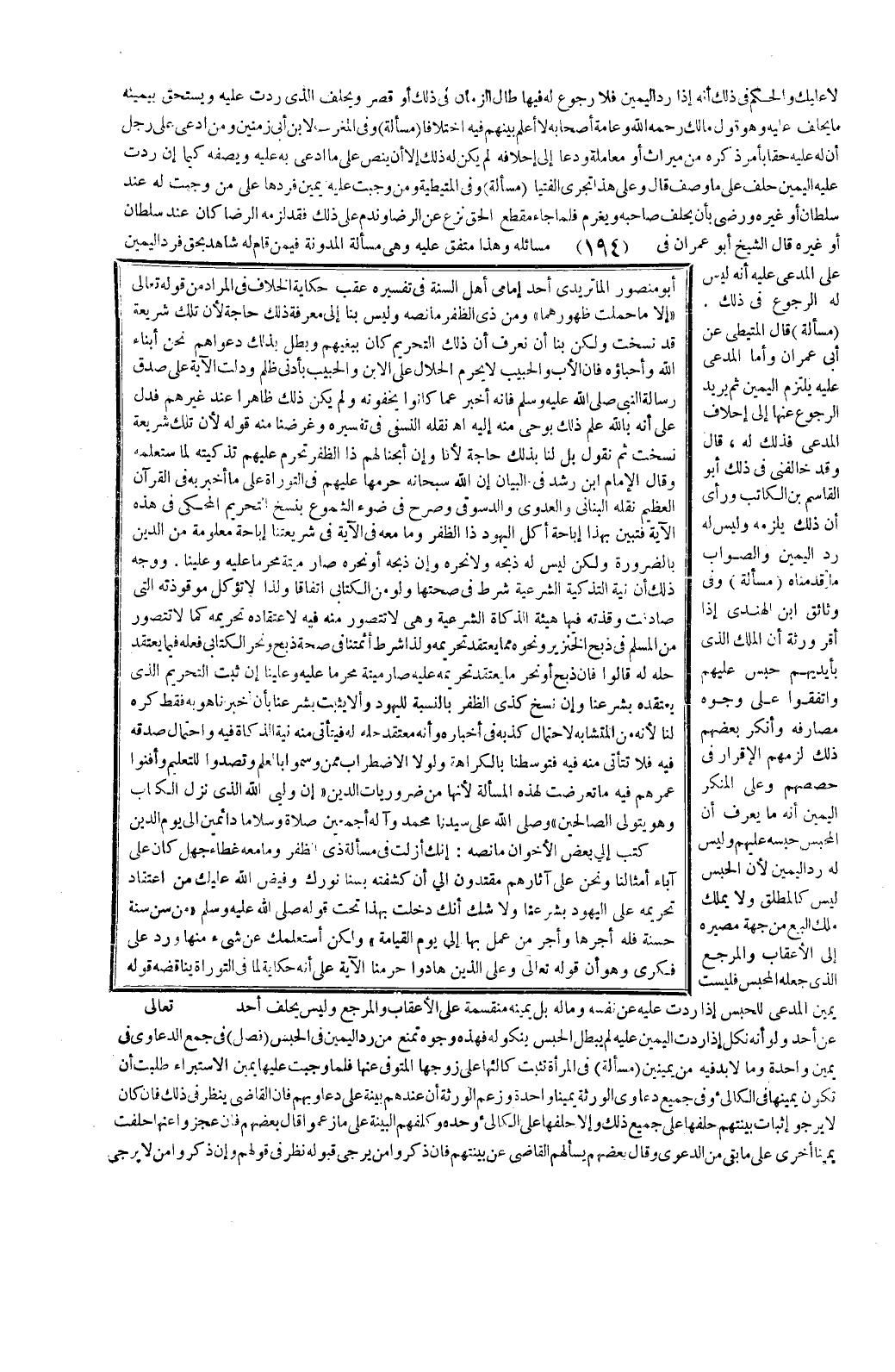 وَدَلَّتْ الْآيَةُ عَلَى صِدْقِ رِسَالَةِ النَّبِيِّ - صَلَّى اللَّهُ عَلَيْهِ وَسَلَّمَ - فَإِنَّهُ أَخْبَرَ عَمَّا كَانُوا يُخْفُونَهُ، وَلَمْ يَكُنْ ذَلِكَ ظَاهِرًا عِنْدَ غَيْرِهِمْ فَدَلَّ عَلَى أَنَّهُ بِاَللَّهِ عَلِمَ ذَلِكَ بِوَحْيٍ مِنْهُ إلَيْهِ اهـ. نَقَلَهُ النَّسَفِيُّ فِي تَفْسِيرِهِ، وَغَرَضُنَا مِنْهُ قَوْلُهُ؛ لِأَنَّ تِلْكَ شَرِيعَةٌ نُسِخَتْ، ثُمَّ نَقُولُ: بَلْ لَنَا بِذَلِكَ حَاجَةٌ؛ لِأَنَّا، وَإِنْ أَبَحْنَا لَهُمْ ذَا الظُّفُرِ تَحْرُمُ عَلَيْهِمْ تَذْكِيَتُهُ لِمَا سَتَعْلَمُهُ وَقَالَ الْإِمَامُ ابْنُ رُشْدٍ فِي الْبَيَانِ إنَّ اللَّهَ سُبْحَانَهُ حَرَّمَهَا عَلَيْهِمْ فِي التَّوْرَاةِ عَلَى مَا أَخْبَرَ بِهِ فِي الْقُرْآنِ الْعَظِيمِ نَقَلَهُ الْبُنَانِيُّ وَالْعَدَوِيُّ وَالدُّسُوقِيُّ، وَصَرَّحَ فِي ضَوْءِ الشُّمُوعِ بِنَسْخِ التَّحْرِيمِ الْمَحْكِيِّ فِي هَذِهِ الْآيَةِ فَتَبَيَّنَ بِهَذَا إبَاحَةُ أَكْلِ الْيَهُودِ ذَا الظُّفُرِ، وَمَا مَعَهُ فِي الْآيَةِ فِي شَرِيعَتِنَا إبَاحَةً مَعْلُومَةً مِنْ الدِّينِ بِالضَّرُورَةِ، وَلَكِنْ لَيْسَ لَهُ ذَبْحُهُ، وَلَا نَحْرُهُ، وَإِنْ ذَبَحَهُ أَوْ نَحَرَهُ صَارَ مَيْتَةً مُحَرَّمًا عَلَيْهِ، وَعَلَيْنَا وَوَجْهُ ذَلِكَ أَنَّ نِيَّةَ التَّذْكِيَةِ الشَّرْعِيَّةِ شَرْطٌ فِي صِحَّتِهَا، وَلَوْ مِنْ الْكِتَابِيِّ اتِّفَاقًا؛ وَلِذَا لَا تُؤْكَلُ مَوْقُوذَتُهُ الَّتِي صَادَفَتْ وَقْذَتُهُ فِيهَا هَيْئَةَ الذَّكَاةِ الشَّرْعِيَّةِ، وَهِيَ لَا تُتَصَوَّرُ مِنْهُ فِيهِ لِاعْتِقَادِهِ تَحْرِيمَهُ كَمَا لَا تُتَصَوَّرُ مِنْ الْمُسْلِمِ فِي ذَبْحِ الْخِنْزِيرِ، وَنَحْوِهِ مِمَّا يَعْتَقِدُ تَحْرِيمَهُ؛ وَلِذَا شَرَطَ أَئِمَّتُنَا فِي صِحَّةِ ذَبْحِ، وَنَحْرِ الْكِتَابِيِّ فِعْلَهُ فِيمَا يَعْتَقِدُ حِلَّهُ لَهُ قَالُوا فَإِنْ ذَبَحَ أَوْ نَحَرَ مَا يَعْتَقِدُ تَحْرِيمَهُ عَلَيْهِ صَارَ مَيْتَةً مُحَرَّمًا عَلَيْهِ، وَعَلَيْنَا إنْ ثَبَتَ التَّحْرِيمُ الَّذِي يَعْتَقِدُهُ بِشَرْعِنَا، وَإِنْ نُسِخَ كَذِي الظُّفُرِ بِالنِّسْبَةِ لِلْيَهُودِ، وَأَلَّا يَثْبُتَ بِشَرْعِنَا بِأَنْ أَخْبَرَنَا هُوَ بِهِ فَقَطْ كُرِهَ لَنَا؛ لِأَنَّهُ مِنْ الْمُتَشَابِهِ لِاحْتِمَالِ كَذِبِهِ فِي إخْبَارِهِ، وَأَنَّهُ مُعْتَقِدٌ حِلَّهُ لَهُ فَيَتَأَتَّى مِنْهُ نِيَّةُ الذَّكَاةِ فِيهِ، وَاحْتِمَالُ صِدْقِهِ فِيهِ فَلَا يَتَأَتَّى مِنْهُ فِيهِ فَتَوَسَّطْنَا بِالْكَرَاهَةِ، وَلَوْلَا الِاضْطِرَابُ مِمَّنْ وُسِمُوا بِالْعِلْمِ، وَتَصَدَّوْا لِلتَّعْلِيمِ، وَأَفْنَوْا عُمُرَهُمْ فِيهِ مَا تَعَرَّضْت لِهَذِهِ الْمَسْأَلَةِ؛ لِأَنَّهَا مِنْ ضَرُورِيَّاتِ الدِّينِ " {إِنَّ وَلِيِّيَ اللَّهُ الَّذِي نَزَّلَ الْكِتَابَ وَهُوَ يَتَوَلَّى الصَّالِحِينَ} [الأعراف: 196] وَصَلَّى اللَّهُ عَلَى سَيِّدِنَا مُحَمَّدٍ، وَآلِهِ أَجْمَعِينَ صَلَاةً، وَسَلَامًا دَائِمَيْنِ إلَى يَوْمِ الدِّينِ.
