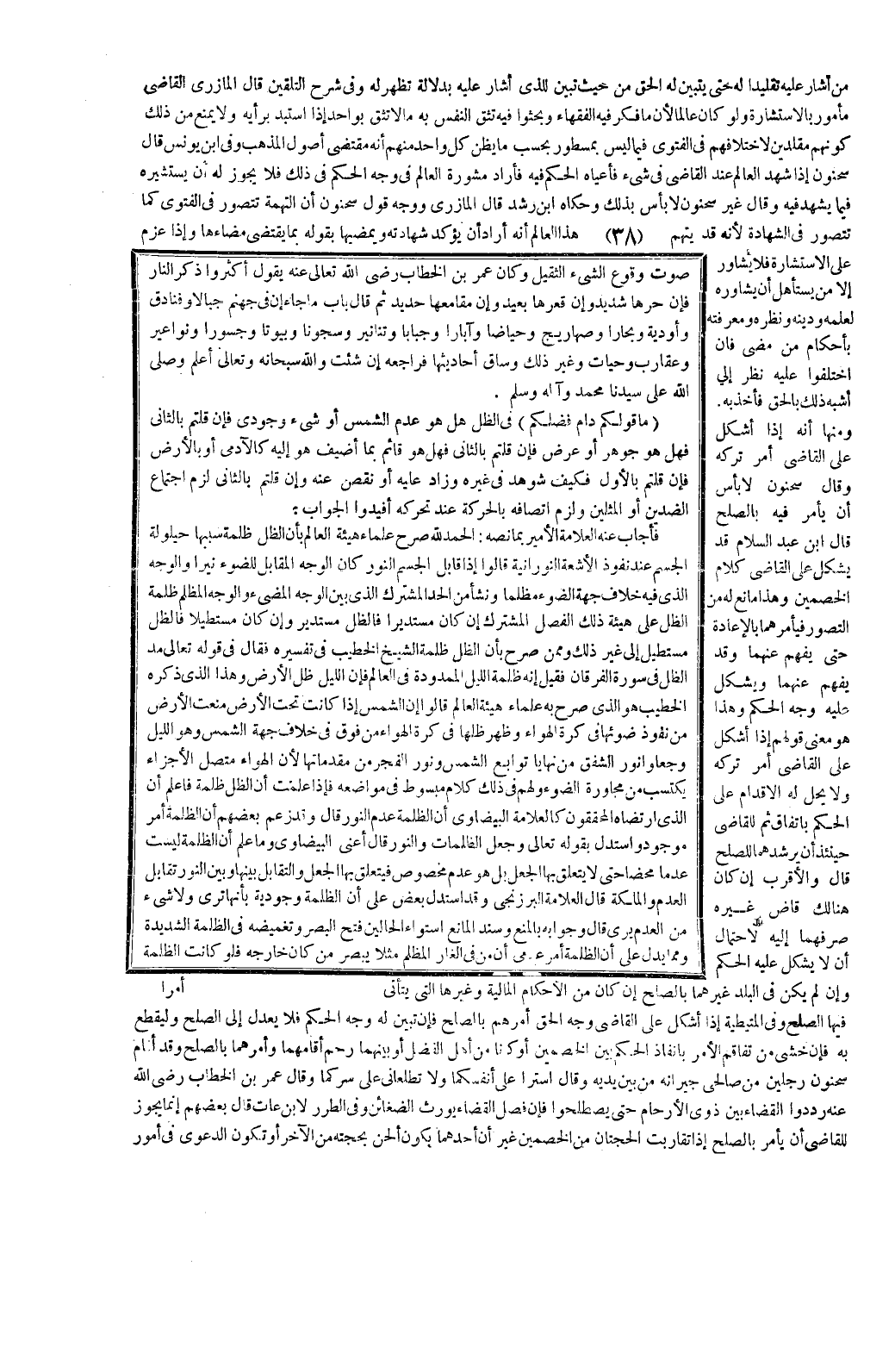 فَأَجَابَ عَنْهُ الْعَلَّامَةُ الْأَمِيرُ بِمَا نَصُّهُ: " الْحَمْدُ لِلَّهِ صَرَّحَ عُلَمَاءُ هَيْئَةِ الْعَالَمِ بِأَنَّ الظِّلَّ ظُلْمَةٌ سَبَبُهَا حَيْلُولَةُ الْجِسْمِ عِنْدَ نُفُوذِ الْأَشِعَّةِ النُّورَانِيَّةِ قَالُوا إذَا قَابَلَ الْجِسْمُ النُّورَ كَانَ الْوَجْهُ الْمُقَابِلُ لِلضَّوْءِ نَيِّرًا وَالْوَجْهُ الَّذِي فِيهِ خِلَافَ جِهَةِ الضَّوْءِ مُظْلِمًا وَنَشَأَ مِنْ الْحَدِّ الْمُشْتَرَكِ الَّذِي بَيْنَ الْوَجْهِ الْمُضِيءِ وَالْوَجْهِ الْمُظْلِمِ ظُلْمَةُ الظِّلِّ عَلَى هَيْئَةِ ذَلِكَ الْفَصْلِ الْمُشْتَرَكِ إنْ كَانَ مُسْتَدِيرًا فَالظِّلُّ مُسْتَدِيرٌ وَإِنْ كَانَ مُسْتَطِيلًا فَالظِّلُّ مُسْتَطِيلٌ إلَى غَيْرِ ذَلِكَ وَمِمَّنْ صَرَّحَ بِأَنَّ الظِّلَّ ظُلْمَةٌ الشَّيْخُ الْخَطِيبُ فِي تَفْسِيرِهِ فَقَالَ فِي قَوْله تَعَالَى مَدِّ الظِّلِّ فِي سُورَةِ الْفُرْقَانِ فَقِيلَ إنَّهُ ظُلْمَةُ اللَّيْلِ الْمَمْدُودَةُ فِي الْعَالَمِ فَإِنَّ اللَّيْلَ ظِلُّ الْأَرْضِ.