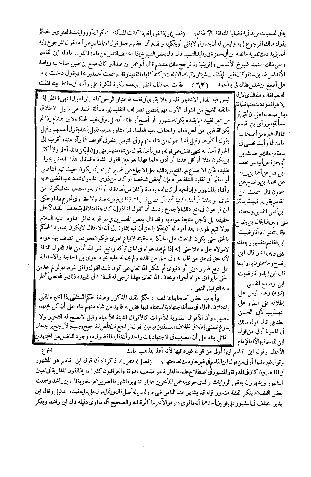 لَيْسَ فِي فَضْلِ الِاخْتِيَارِ قَلَّدَ رَجُلًا يَقْوَى فِي نَفْسِهِ فَاخْتِيَارُ الرَّجُلِ كَاخْتِيَارِ الْقَوْلِ انْتَهَى. فَانْظُرْ إلَى مَا نَقَلَهُ الشَّيْخُ مِنْ الْقَوْلِ الْأَوَّلِ فَهُوَ يَقْتَضِي انْصِرَافَ التَّقْلِيدِ إلَى مَسْأَلَةِ الْمُقَلِّدِ عَلَى سَبِيلِ الْإِطْلَاقِ مِنْ غَيْرِ تَقْيِيدٍ فِيمَا يُقَلِّدُهُ بِكَوْنِهِ مَشْهُورًا أَوْ أَصَحَّ أَوْ قَائِلُهُ أَفْضَلُ.