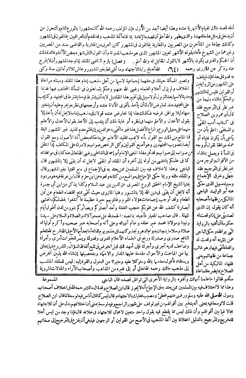 وَكَمَا يَجِبُ عَلَى الْمُجْتَهِدِ عِنْدَ تَعَارُضِ الْأَدِلَّةِ أَنْ يَأْخُذَ بِأَقْوَى الْأَدِلَّةِ عِنْدَهُ وَأَرْجَحِهَا فِي نَظَرِهِ وَيَحْرُمُ عَلَيْهِ أَنْ يَتَخَيَّرَ مِنْهَا دَلِيلًا يُوَافِقُ غَرَضَهُ فَكَذَلِكَ هَذَا إذَا تَعَارَضَ عِنْدَهُ قَوْلَانِ فِي مَذْهَبِ إمَامِهِ لَا يَحِلُّ لَهُ أَنْ يَأْخُذَ إلَّا بِقَوْلِ الْأَعْدَلِ وَالْأَعْلَمِ مِنْهُمَا فِي نَظَرِهِ أَوْ غَايَةُ ذَلِكَ أَنْ يَنْدُبَ إلَى الْأَخْذِ بِقَوْلِ الْأَعْدَلِ وَالْأَعْلَمِ مِنْهُمَا عَلَى سَبِيلِ الْوَرَعِ وَاتِّبَاعِ الْأَفْضَلِ هَذَا غَيْرُ مَا أَفْتَى بِهِ عِزُّ الدِّينِ وَإِنْ قُلْتُمْ بِعَدَمِ تَقْلِيدِ غَيْرِ الْمَشْهُورِ أَلْبَتَّةَ فَمَا الْمَانِعُ مِنْ ذَلِكَ مَعَ الْقَوْلِ بِأَنَّهُ لَا يَجِبُ تَقْلِيدُ الْأَعْلَمِ عَلَى مَا حَكَاهُ بَعْضُ أَئِمَّةِ الْأُصُولِ وَمَعَ الْقَوْلِ أَيْضًا بِتَصْوِيبِ الْمُجْتَهِدِينَ وَهُوَ أَصَحُّ الْقَوْلَيْنِ وَكُلُّ الرُّخَصِ صَوَابٌ وَلَا دَرَكَ عَلَى الْمُكَلَّفِ إذَا انْتَقَلَ مِنْ صَوَابٍ إلَى صَوَابٍ وَقَدْ أَفْرَدَ لِهَذَا الْمَعْنَى الْإِمَامُ أَبُو إِسْحَاقَ الشَّاطِبِيُّ - رَضِيَ اللَّهُ تَعَالَى عَنْهُ - كِتَابًا فِي مُوَافَقَاتِهِ كَمَا فِي عِلْمِكُمْ يَقْتَضِي مِنْ أَوَّلِهِ إلَى آخِرِهِ أَنَّ الْمُقَلِّدَ أَوْ الْمُفْتِي لَا يَحِلُّ لَهُ أَنْ يُفْتِيَ إلَّا بِالْمَشْهُورِ قَالَ الْبَاجِيُّ وَهَذَا لَا خِلَافَ فِيهِ بَيْنَ الْمُسْلِمِينَ مِمَّنْ يُعْتَدُّ بِهِ فِي الْإِجْمَاعِ فِي مَنْعِ الْفُتْيَا بِغَيْرِ الْمَشْهُورِ قَالَ وَالْمُقَلِّدُ مِثْلُهُ وَرُبَّمَا حَكَى الْإِجْمَاعَ فِي مَوَاضِعَ مِنْ كِتَابِهِ وَنَحْوُهُ عَنْ ابْنِ حَزْمٍ قَالَ ابْنُ عَرَفَةَ فِيهِ هُوَ مَرْدُودٌ بِفُتْيَا الشَّيْخِ الْإِمَامِ الْمُحَقِّقِ الْوَرِعِ الْمِصْرِيِّ عِزِّ الدِّينِ بْنِ عَبْدِ السَّلَامِ وَكَذَا يُذْكَرُ عَنْ ابْنِ أَبِي جَمْرَةَ أَنَّهُ لَا يَحِلُّ أَنْ يُفْتِيَ فِي دِينِ اللَّهِ إلَّا بِالْمَشْهُورِ وَفُتْيَا الْمَازِرِيِّ حَيْثُ أَفْتَى بِمَنْعِ اقْتِضَاءِ الطَّعَامِ عَنْ ثَمَنِ الطَّعَامِ وَقَدْ أَوْجَبَ إجْمَاعَاتُ هَؤُلَاءِ الْقَوْمِ وَفَتَاوِيهِمْ حَيْرَةً عَظِيمَةً فَاكْشِفُوا بِفَضْلِكُمْ مَا غَشَّى أَبْصَارَنَا كَشَفَ اللَّهُ عَنْ قُلُوبِكُمْ حُجُبَ الْغَفْلَةَ وَأَمَدَّ أَبْصَارَكُمْ وَبَصَائِرَكُمْ بِنُورٍ مِنْ لَدُنْ أَطْوَلِ أَيَّامِ الْمُهْلَةِ.
