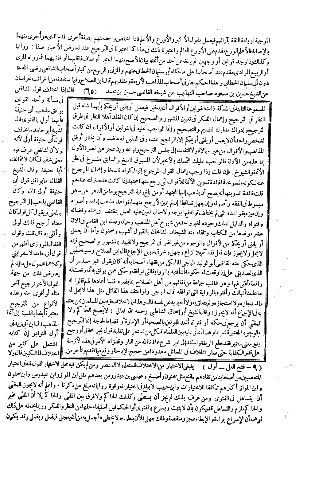 الْمَسْمُوعَةِ الثَّابِتَةِ فِي الْمَسْأَلَةِ ذَاتِ الْقَوْلَيْنِ أَوْ الْأَقْوَالِ أَنْ يَتَخَيَّرَ فَيَعْمَلَ أَوْ يُفْتِيَ أَوْ يَحْكُمَ بِأَيِّهِمَا شَاءَ قَبْلَ النَّظَرِ فِي التَّرْجِيحِ وَإِعْمَالِ الْفِكْرِ فِي تَعْيِينِ الْمَشْهُورِ وَالصَّحِيحِ إنْ كَانَ الْمُقَلِّدُ أَهْلًا لِلنَّظَرِ فِي طُرُقِ التَّرْجِيحِ وَإِدْرَاكِ مَدَارِك التَّقْدِيمِ وَالتَّصْحِيحِ وَإِنَّمَا الْوَاجِبُ عَلَيْهِ فِي الْقَوْلَيْنِ أَوْ الْأَقْوَالِ إنْ كَانَتْ لِشَخْصٍ وَاحِدٍ أَنْ لَا يَعْمَلَ أَوْ يُفْتِيَ أَوْ يَحْكُمَ إلَّا بِالرَّاجِحِ عِنْدَهُ وَفِي الدَّلِيلِ لَهُ عَاضِدٌ وَأَنْ يَخْتَارَ أَوْفَقَ الْمَذَاهِبِ وَالْأَقْوَالِ مِنْ غَيْرِ مُبَالَاةٍ وَلَا الْتِفَاتٍ إلَى جِنْسِ التَّرْجِيحِ وَنَوْعِهِ وَإِنْ عَجَزَ عَنْ نُصْرَةِ الْأَوَّلِ بِمَا عَلَيْهِ مِنْ الْأَدِلَّةِ فَالْوَاجِبُ عَلَيْك التَّمَسُّكُ بِالْأَخِيرِ لِأَنَّ الْمَسْبُوقَ نَاسِخٌ وَالسَّابِقَ مَنْسُوخٌ فِي نَظَرِ الْأَئِمَّةِ وَالشُّيُوخِ.