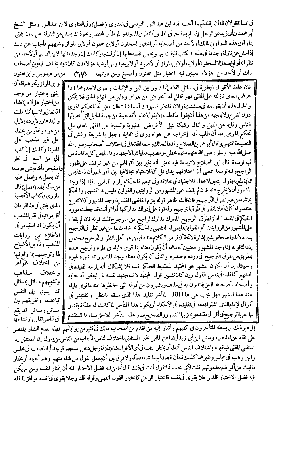 قُلْت قَوْلُهُ فَإِنْ لَمْ يَقِفْ عَلَى الْمَشْهُورِ مِنْ الرِّوَايَتَيْنِ أَوْ الْقَوْلَيْنِ فَلَيْسَ لَهُ التَّشَهِّي وَالْحُكْمُ بِمَا شَاءَ مِنْهُمَا مِنْ غَيْرِ نَظَرٍ فِي التَّرْجِيحِ يَدُلُّ دَلَالَةً وَاضِحَةً وَيُشِيرُ إشَارَةً لَائِحَةً أَنَّ فَرْضَ الْكَلَامِ عِنْدَهُ فِيمَنْ هُوَ أَهْلٌ لِلنَّظَرِ وَالتَّرْجِيحِ فَيَحْتَمِلُ إذْ ذَاكَ قَوْلُهُ إذَا وَجَدَ الْمَشْهُورَ مَعْنَيَيْنِ أَحَدُهُمَا أَنْ يَكُونَ مَعْنَاهُ بِمَا قَوَّى دَلِيلَهُ فِي نَظَرِهِ وَتَرَجَّحَ عِنْدَهُ بِطَرِيقٍ مِنْ طُرُقِ التَّرْجِيحِ فِي وِرْدِهِ وَصَدْرِهِ وَالثَّانِي أَنْ يَكُونَ مَعْنَاهُ وَجَدَ الْمَشْهُورَ مِمَّا شَهَرَهُ غَيْرُهُ وَحِينَئِذٍ إمَّا أَنْ يَكُونَ الْمُشْهِرُ هُوَ الْمُجْتَهِدُ الْمُسْتَنْبَطُ لِلْحُكْمِ نَفْسِهِ فَلَا إشْكَالَ أَنَّهُ يَلْزَمُهُ تَقْلِيدُهُ فِي التَّشْهِيرِ كَمَا قَلَّدَهُ فِي نَفْسِ الْقَوْلِ وَإِنْ كَانَ تَشْهِيرُ قَوْلِ الْمُجْتَهِدِ لَا لِلْمُجْتَهِدِ نَفْسِهِ بَلْ لِبَعْضِ أَصْحَابِهِ وَأَصْحَابِ أَصْحَابِهِ الَّذِينَ يَقْتَدُونَ بِهِ فِي مَذْهَبِهِ وَيُشْهِرُونَ مِنْ أَقْوَالِهِ الَّتِي حَفِظُوهَا عَنْهُ مَا قَوِيَ دَلِيلَهُ عِنْدَ هَذَا الْمُشْهِرِ فَهَلْ يَجِبُ عَلَى هَذَا الْمُقَلِّدِ الْمُتَأَخِّرِ تَقْلِيدُ هَذَا الَّذِي سَبَقَهُ بِالنَّظَرِ وَالتَّفْتِيشِ فِي أَقْوَالِ الْإِمَامِ الَّذِي اشْتَرَكَ مَعَهُ فِي تَقْلِيدِهِ فِي الْأَحْكَامِ أَوْ يَكُونُ هَذَا الْمُتَأَخِّرُ لَمَّا كَانَتْ لَهُ مَلَكَةٌ يَقْتَدِرُ بِهَا عَلَى التَّرْجِيحِ فِي أَقْوَالِ مُقَلِّدِهِ وَيُمَيِّزُ بِهَا الْمَشْهُورَ وَالصَّحِيحَ صَارَ هَذَا الْمُتَأَخِّرُ اللَّاحِقُ مُسَاوِيًا لِلْمُتَقَدِّمِ