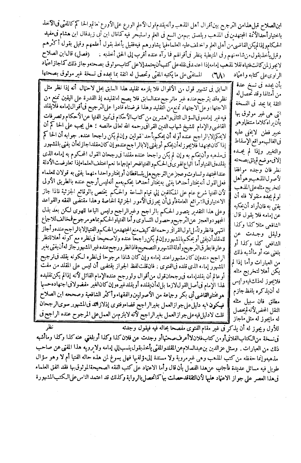 فَانْظُرْ وَتَأَمَّلْ قَوْلَ الْقَرَافِيُّ - رَحِمَهُ اللَّهُ - كَيْفَ مَنَعَ الْمُجْتَهِدَ مِنْ الْحُكْمِ وَالْفُتْيَا إلَّا بِالرَّاجِحِ عِنْدَهُ وَأَجَازَ لِلْمُقَلِّدِ أَنْ يُفْتِيَ أَوْ يَحْكُمَ بِالْمَشْهُورِ وَإِنْ لَمْ يَكُنْ رَاجِحًا عِنْدَهُ وَلَا صَحِيحًا فِي نَظَرِهِ مَعَ كَوْنِهِ أَهْلًا لِلنَّظَرِ وَعَارِفًا بِطُرُقِ التَّرْجِيحِ وَأَدِلَّةِ التَّشْهِيرِ وَالتَّصْحِيحِ فَإِذَا نَظَرَ وَرَجَحَ عِنْدَهُ غَيْرُ الْمَشْهُورِ جَازَ لَهُ أَنْ يُفْتِيَ بِغَيْرِ الرَّاجِحِ عِنْدَهُ إنْ كَانَ مَشْهُورًا عِنْدَ إمَامِهِ وَإِنْ كَانَ شَاذًّا مَرْجُوحًا فِي نَظَرِهِ لِكَوْنِهِ يُقَلِّدُ فِي تَرْجِيحِ الْمَشْهُورِ إمَامَهُ الَّذِي قَلَّدَهُ فِي الْفَتْوَى.