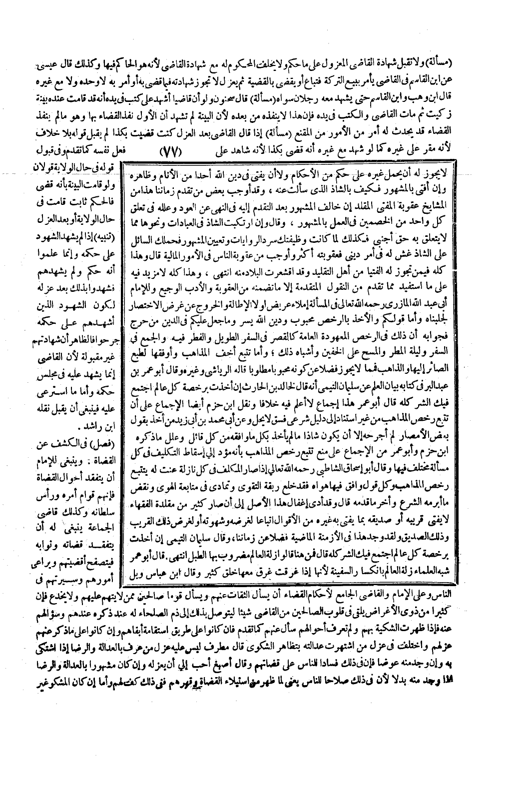 وَقَالَ وَإِنْ ارْتَكَبْتَ الشَّاذَّ فِي الْعِبَادَاتِ وَنَحْوِهَا مِمَّا لَا يَتَعَلَّقُ بِهِ حَقُّ أَجْنَبِيٍّ فَكَذَلِكَ لَمَّا كَانَتْ وَظِيفَتُك سَرْدَ الرِّوَايَاتِ وَتَعْيِينَ الْمَشْهُورِ فَحَمْلُك السَّائِلَ عَلَى الشَّاذِّ غِشٌّ لَهُ فِي أَمْرٍ دِينِيٍّ فَعُقُوبَتُهُ أَكْثَرُ وَأَوْجَبُ مِنْ عُقُوبَةِ النَّاسِ فِي الْأُمُورِ الْمَالِيَّةِ قَالَ وَهَذَا كُلُّهُ فِيمَنْ تَجُوزُ لَهُ الْفُتْيَا مِنْ أَهْلِ التَّقْلِيدِ، وَقَدْ اقْشَعَرَّتْ الْبِلَادُ مِنْهُ انْتَهَى، وَهَذَا كُلُّهُ لَا مَزِيدَ فِيهِ عَلَى مَا اُسْتُفِيدَ مِمَّا تَقَدَّمَ مِنْ النُّقُولِ الْمُتَقَدِّمَةِ إلَّا مَا تَضَمَّنَهُ مِنْ الْعُقُوبَةِ وَالْأَدَبِ الْوَجِيعِ وَلِلْإِمَامِ أَبِي عَبْدِ اللَّهِ الْمَازِرِيِّ - رَحِمَهُ اللَّهُ تَعَالَى - فِي الْمَسْأَلَةِ إمْلَاءٌ عَرِيضٌ لَوْلَا الْإِطَالَةُ وَالْخُرُوجُ عَنْ غَرَضِ الِاخْتِصَارِ لَجَلَبْنَاهُ وَأَمَّا قَوْلُكُمْ وَالْأَخْذُ بِالرُّخَصِ مَحْبُوبٌ وَدِينُ اللَّهِ يُسْرٌ وَمَا جَعَلَ عَلَيْكُمْ فِي الدِّينِ مِنْ حَرَجٍ فَجَوَابُهُ أَنَّ ذَلِكَ فِي الرُّخَصِ الْمَعْهُودَةِ الْعَامَّةِ كَالْقَصْرِ فِي السَّفَرِ الطَّوِيلِ وَالْفِطْرِ فِيهِ وَالْجَمْعِ فِي السَّفَرِ وَلَيْلَةِ الْمَطَرِ وَالْمَسْحِ عَلَى الْخُفَّيْنِ وَأَشْبَاهِ ذَلِكَ.