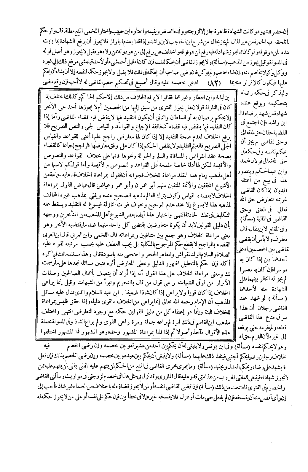 ابْنُ لُبَابَةَ وَابْنُ الْعَطَّارِ وَغَيْرُهُمَا فَقَالُوا لَا يَرْفَعُ الْخِلَافَ مِنْ ذَلِكَ إلَّا حُكْمُ الْحَاكِمِ، وَكَذَلِكَ اُخْتُلِفَ إذَا كَانَ فِي النَّازِلَةِ قَوْلَانِ هَلْ يُجَوِّزُ الْفَتْوَى مَنْ سَبَقَ إلَيْهَا مِنْ الْخَصْمَيْنِ أَمْ لَا يُجَوِّزُهَا أَحَدٌ عَلَى الْآخَرِ إلَّا بِحُكْمٍ يَرْضَيَانِ بِهِ أَوْ السُّلْطَانِ، وَالثَّانِي أَنْ يَكُونَ التَّقْلِيدُ فِيمَا لَا يُنْقَضُ فِيهِ قَضَاءُ الْقَاضِي وَأَمَّا إذَا كَانَ التَّقْلِيدُ فِيمَا يُنْقَضُ فِيهِ قَضَاءٌ كَمُخَالَفَةِ الْإِجْمَاعِ وَالْقَوَاعِدِ وَالْقِيَاسِ الْجَلِيِّ وَالنَّصِّ الصَّرِيحِ فَلَا يَرْفَعُ الْخِلَافَ لِعَدَمِ صِحَّةِ التَّقْلِيدِ إلَّا إذَا كَانَ لَهَا مُعَارِضٌ رَاجِحٌ عَلَيْهَا أَعْنِي لِلْقَوَاعِدِ، وَالْقِيَاسِ الْجَلِيِّ الصَّرِيحِ فَإِنَّهُ يَتِمُّ التَّقْلِيدُ وَلَا يُنْقَضُ الْحُكْمُ إذَا كَانَ عَلَى وَفْقِ مُعَارِضِهَا الرَّاجِحِ إجْمَاعًا كَالْقَضَاءِ بِصِحَّةِ عَقْدِ الْقِرَاضِ وَالْمُسَاقَاةِ وَالسَّلَمِ وَالْحَوَالَةِ وَنَحْوِهَا فَإِنَّهَا عَلَى خِلَافِ الْقَوَاعِدِ وَالنُّصُوصِ وَالْأَقْيِسَةِ لَكِنْ لَهَا أَدِلَّةٌ خَاصَّةٌ مُقَدَّمَةٌ عَلَى الْقَوَاعِدِ وَالنُّصُوصِ وَالْأَقْيِسَةِ، وَأَمَّا قَوْلُكُمْ لَا سِيَّمَا مِنْ أَهْلِ مَذْهَبِ إمَامِ هَذَا الْمُقَلِّدِ مُرَاعَاةً لِلْخِلَافِ فَجَوَابُهُ أَنَّ الْقَوْلَ بِمُرَاعَاةِ الْخِلَافِ قَدْ عَابَهُ جَمَاعَةٌ مِنْ الْأَشْيَاخِ الْمُحَقِّقِينَ وَالْأَئِمَّةِ الْمُتَّقِينَ مِنْهُمْ أَبُو عِمْرَانَ وَأَبُو عُمَرَ وَعِيَاضٌ قَالَ عِيَاضٌ الْقَوْلُ بِمُرَاعَاةِ الْخِلَافِ لَا يُعَضِّدُهُ الْقِيَاسُ وَكَيْفَ يَتْرُكُ الْعَالِمُ مَذْهَبَهُ الصَّحِيحَ عِنْدَهُ وَيُفْتِي بِمَذْهَبِ غَيْرِهِ الْمُخَالِفِ لِمَذْهَبِهِ هَذَا لَا يَسُوغُ إلَّا عِنْدَ عَدَمِ التَّرْجِيحِ وَخَوْفِ فَوَاتِ النَّازِلَةِ فَيَسُوغُ لَهُ التَّقْلِيدُ وَيَسْقُطُ عَنْهُ التَّكْلِيفُ فِي تِلْكَ الْحَادِثَةِ انْتَهَى.