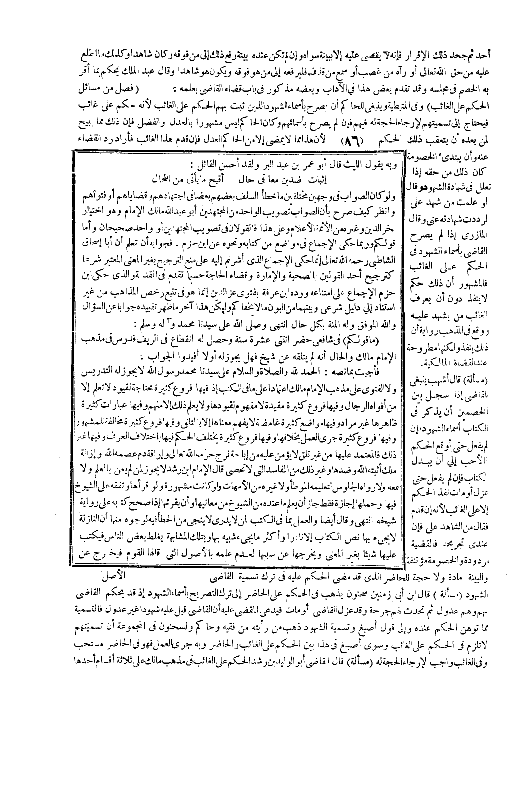 فَأَجَبْتُ بِمَا نَصُّهُ: الْحَمْدُ لِلَّهِ وَالصَّلَاةُ وَالسَّلَامُ عَلَى سَيِّدِنَا مُحَمَّدٍ رَسُولِ اللَّهِ لَا يَجُوزُ لَهُ التَّدْرِيسُ وَلَا الْفَتْوَى عَلَى مَذْهَبِ الْإِمَامِ مَالِكٍ اعْتِمَادًا عَلَى مَا فِي الْكُتُبِ إذْ فِيهَا فُرُوعٌ كَثِيرَةٌ مُحْتَاجَةٌ لِقُيُودٍ لَا تُعْلَمُ إلَّا مِنْ أَفْوَاهِ الرِّجَالِ وَفِيهَا فُرُوعٌ كَثِيرَةٌ مُقَيَّدَةٌ لَا مَفْهُومَ لِقُيُودِهَا وَلَا يُعْلَمُ ذَلِكَ إلَّا مِنْهُمْ وَفِيهَا عِبَارَاتٌ كَثِيرَةٌ ظَاهِرُهَا غَيْرُ مُرَادٍ وَفِيهَا مَوَاضِعُ كَثِيرَةٌ غَامِضَةٌ لَا يُفْهَمُ مَعْنَاهَا إلَّا بِالتَّلَقِّي وَفِيهَا فُرُوعٌ كَثِيرَةٌ مُخَالِفَةٌ لِلْمَشْهُورِ وَفِيهَا فُرُوعٌ كَثِيرَةٌ جَرَى الْعَمَلُ بِخِلَافِهَا وَفِيهَا فُرُوعٌ كَثِيرَةٌ يَخْتَلِفُ الْحُكْمُ فِيهَا بِاخْتِلَافِ الْعُرْفِ وَفِيهَا غَيْرُ ذَلِكَ فَالْمُعْتَمِدُ عَلَيْهَا مِنْ غَيْرِ تَلَقٍّ لَا يُؤْمَنُ عَلَيْهِ مِنْ إبَاحَةِ فَرْجٍ حَرَّمَهُ اللَّهُ تَعَالَى، وَإِرَاقَةِ دَمٍ عَصَمَهُ اللَّهُ وَإِزَالَةِ مِلْكٍ أَثْبَتَهُ اللَّهُ وَضِدِّهَا وَغَيْرِ ذَلِكَ مِنْ الْمَفَاسِدِ الَّتِي لَا تُحْصَى قَالَ الْإِمَامُ ابْنُ رُشْدٍ لَا يَجُوزُ لِمَنْ لَمْ يُعْنَ بِالْعِلْمِ وَلَا سَمِعَهُ وَلَا رَوَاهُ الْجُلُوسُ لِتَعْلِيمِهِ الْمُوَطَّأَ وَلَا غَيْرَهُ مِنْ الْأُمَّهَاتِ وَلَوْ كَانَتْ مَشْهُورَةً وَلَوْ قَرَأَهَا وَتَفَقَّهَ عَلَى الشُّيُوخِ فِيهَا وَحَمَلَهَا إجَازَةً فَقَطْ جَازَ أَنْ يُعَلِّمَ مَا عِنْدَهُ مِنْ الشُّيُوخِ مِنْ مَعَانِيهَا وَأَنْ يُقْرِئَهَا إذَا صَحَّحَ كِتَابَهُ عَلَى رِوَايَةِ شَيْخِهِ انْتَهَى.