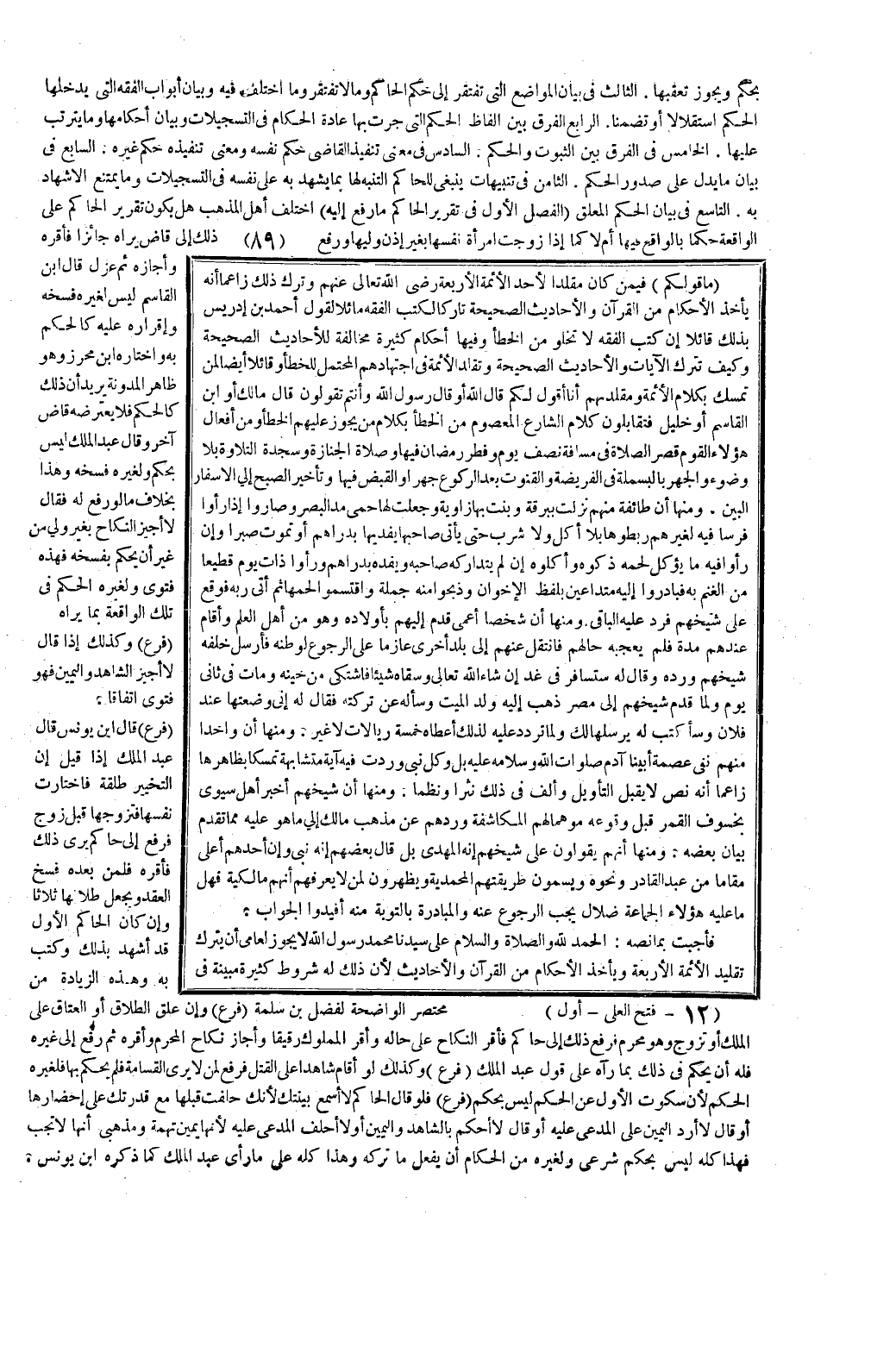 مَا قَوْلُكُمْ) فِيمَنْ كَانَ مُقَلِّدًا لِأَحَدِ الْأَئِمَّةِ الْأَرْبَعَةِ - رَضِيَ اللَّهُ تَعَالَى عَنْهُمْ - وَتَرَكَ ذَلِكَ زَاعِمًا أَنَّهُ يَأْخُذُ الْأَحْكَامَ مِنْ الْقُرْآنِ وَالْأَحَادِيثِ الصَّحِيحَةِ تَارِكًا لِكُتُبِ الْفِقْهِ مَائِلًا لِقَوْلِ أَحْمَدَ بْنِ إدْرِيسَ بِذَلِكَ قَائِلًا إنَّ كُتُبَ الْفِقْهِ لَا تَخْلُو مِنْ الْخَطَأِ وَفِيهَا أَحْكَامٌ كَثِيرَةٌ مُخَالِفَةٌ لِلْأَحَادِيثِ الصَّحِيحَةِ وَكَيْفَ تَتْرُكُ الْآيَاتِ وَالْأَحَادِيثَ الصَّحِيحَةَ وَتُقَلِّدُ الْأَئِمَّةَ فِي اجْتِهَادِهِمْ الْمُحْتَمَلِ لِلْخَطَأِ وَقَائِلًا أَيْضًا لِمَنْ تَمَسَّكَ بِكَلَامِ الْأَئِمَّةِ وَمُقَلِّدِيهِمْ أَنَا أَقُولُ لَكُمْ قَالَ اللَّهُ أَوْ قَالَ رَسُولُ اللَّهِ وَأَنْتُمْ تَقُولُونَ قَالَ مَالِكٌ أَوْ ابْنُ الْقَاسِمِ أَوْ خَلِيلٌ فَتُقَابِلُونَ كَلَامَ الشَّارِعِ الْمَعْصُومِ مِنْ الْخَطَأِ بِكَلَامِ مَنْ يَجُوزُ عَلَيْهِمْ الْخَطَأُ، وَمِنْ أَفْعَالِ هَؤُلَاءِ الْقَوْمِ قَصْرُ الصَّلَاةِ فِي مَسَافَةِ نِصْفِ يَوْمٍ وَفِطْرُ رَمَضَانَ فِيهَا وَصَلَاةُ الْجِنَازَةِ وَسَجْدَةُ التِّلَاوَةِ بِلَا وُضُوءٍ وَالْجَهْرُ بِالْبَسْمَلَةِ فِي الْفَرِيضَةِ وَالْقُنُوتُ بَعْدَ الرُّكُوعِ جَهْرًا وَالْقَبْضُ فِيهَا وَتَأْخِيرُ الصُّبْحِ إلَى الْإِسْفَارِ الْبَيِّنِ. وَمِنْهَا أَنَّ طَائِفَةً مِنْهُمْ نَزَلَتْ بِبَرْقَةَ وَبَنَتْ بِهَا زَاوِيَةً وَجَعَلَتْ لَهَا حِمًى مَدَّ الْبَصَرِ وَصَارُوا إذَا رَأَوْا فَرَسًا فِيهِ لِغَيْرِهِمْ رَبَطُوهَا بِلَا أَكْلٍ وَلَا شُرْبٍ حَتَّى يَأْتِيَ صَاحِبُهَا يَفْدِيهَا بِدَرَاهِمَ أَوْ تَمُوتُ صَبْرًا وَإِنْ رَأَوْا فِيهِ مَا يُؤْكَلُ لَحْمُهُ ذَكُّوهُ وَأَكَلُوهُ إنْ لَمْ يَتَدَارَكْهُ صَاحِبُهُ وَيَفْدِهِ بِدَرَاهِمَ وَرَأَوْا ذَاتَ يَوْمٍ قَطِيعًا مِنْ الْغَنَمِ بِهِ فَبَادَرُوا إلَيْهِ مُتَدَاعِينَ بِلَفْظِ الْإِخْوَانِ وَذَبَحُوا مِنْهُ جُمْلَةً وَاقْتَسَمُوا لَحْمَهَا ثُمَّ أَتَى رَبُّهُ فَوَقَعَ عَلَى شَيْخِهِمْ فَرَدَّ عَلَيْهِ الْبَاقِيَ.