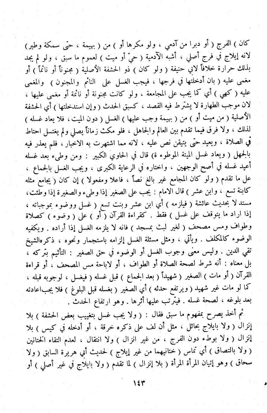 (وَلَوْ كَانَ الْمُجَامِعُ غَيْرَ بَالِغٍ نَصًّا، فَاعِلًا وَمَفْعُولًا) إنْ كَانَ (يُجَامِعُ مِثْلَهُ كَابْنَةِ تِسْعٍ، وَابْنِ عَشْرٍ) قَالَ الْإِمَامُ: يَجِبُ عَلَى الصَّغِيرِ إذَا وَطِئَ وَالصَّغِيرَةِ إذَا وُطِئَتْ، مُسْتَدِلًّا بِحَدِيثِ عَائِشَةَ (فَيَلْزَمُهُ) أَيْ: ابْنَ عَشْرٍ وَبِنْتَ تِسْعٍ (غُسْلٌ وَوُضُوءٌ بِمُوجِبَاتِهِ، إذَا أَرَادَ مَا يَتَوَقَّفُ عَلَى غُسْلٍ) فَقَطْ كَقِرَاءَةِ الْقُرْآنِ (أَوْ) عَلَى (وُضُوءٍ) كَصَلَاةٍ وَطَوَافٍ وَمَسِّ مُصْحَفٍ (لِغَيْرِ لُبْثٍ بِمَسْجِدٍ) فَإِنَّهُ لَا يَلْزَمُهُ الْغُسْلُ إذَا أَرَادَهُ وَيَكْفِيهِ الْوُضُوءُ كَالْمُكَلَّفِ وَيَأْتِي، وَمَثَلُ مَسْأَلَةِ الْغُسْلِ إلْزَامُهُ بِاسْتِجْمَارٍ وَنَحْوِهِ، ذَكَرَهُ الشَّيْخُ تَقِيُّ الدِّينِ وَلَيْسَ مَعْنَى وُجُوبِ الْغُسْلِ أَوْ الْوُضُوءِ فِي حَقِّ الصَّغِيرِ: التَّأْثِيمُ بِتَرْكِهِ، بَلْ مَعْنَاهُ: أَنَّهُ شَرْطٌ لِصِحَّةِ الصَّلَاةِ أَوْ الطَّوَافِ، أَوْ لِإِبَاحَةِ مَسِّ الْمُصْحَفِ، أَوْ قِرَاءَةِ الْقُرْآنِ.