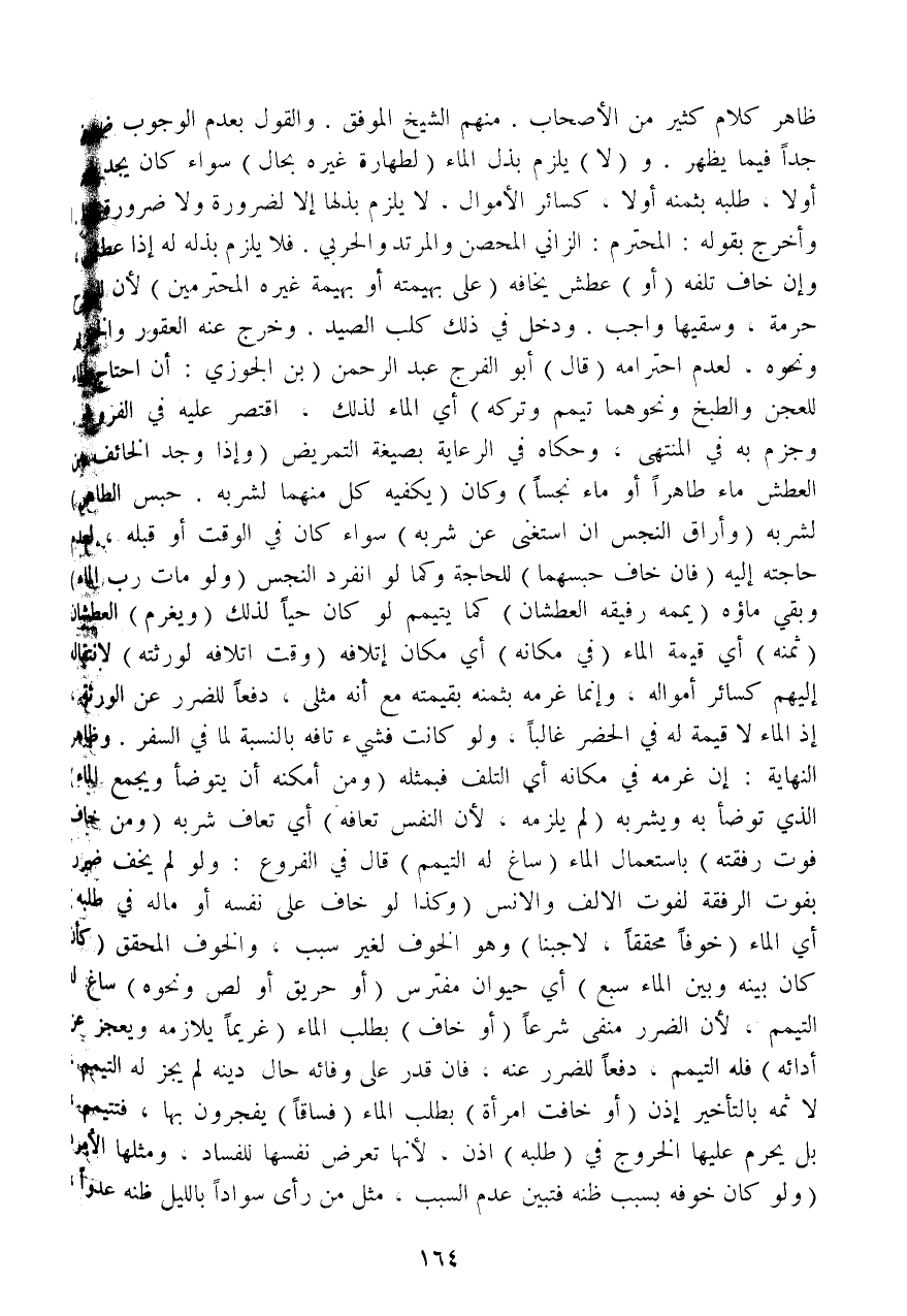 (قَالَ) أَبُو الْفَرَجِ عَبْدُ الرَّحْمَنِ (بْنُ الْجَوْزِيِّ: إنْ احْتَاجَ الْمَاءَ لِلْعَجْنِ وَالطَّبْخِ وَنَحْوِهِمَا تَيَمَّمَ وَتَرَكَهُ) أَيْ: الْمَاءَ لِذَلِكَ، اقْتَصَرَ عَلَيْهِ فِي الْفُرُوعِ وَجَزَمَ بِهِ فِي الْمُنْتَهَى، وَحَكَاهُ فِي الرِّعَايَةِ بِصِيغَةِ التَّمْرِيضِ.