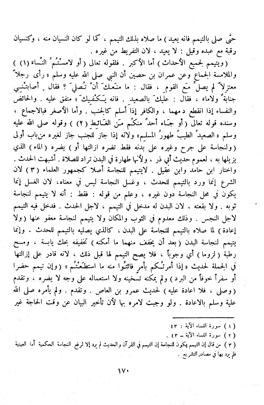 وَعَنْ عِمْرَانَ بْنِ حُصَيْنٍ أَنَّ النَّبِيَّ - صَلَّى اللَّهُ عَلَيْهِ وَسَلَّمَ - رَأَى رَجُلًا مُعْتَزِلًا لَمْ يُصَلِّي مَعَ الْقَوْمِ، فَقَالَ: «مَا مَنَعَكَ أَنْ تُصَلِّيَ؟ فَقَالَ: أَصَابَتْنِي جَنَابَةٌ وَلَا مَاءَ، فَقَالَ: عَلَيْكَ بِالصَّعِيدِ فَإِنَّهُ يَكْفِيكَ» مُتَّفَقٌ عَلَيْهِ وَالْحَائِضُ وَالنُّفَسَاءُ إذَا انْقَطَعَ دَمُهُمَا وَالْكَافِرُ إذَا أَسْلَمَ كَالْجُنُبِ وَأَمَّا الْأَصْغَرُ فَبِالْإِجْمَاعِ، وَسَنَدُهُ قَوْله تَعَالَى {أَوْ جَاءَ أَحَدٌ مِنْكُمْ مِنَ الْغَائِطِ} [المائدة: ٦] وَقَوْلُهُ - صَلَّى اللَّهُ عَلَيْهِ وَسَلَّمَ - «الصَّعِيدُ الطَّيِّبُ طَهُورُ الْمُسْلِمِ» وَلِأَنَّهُ إذَا جَازَ لِلْجُنُبِ جَازَ لِغَيْرِهِ مِنْ بَابِ أَوْلَى.