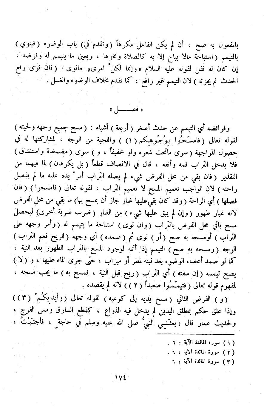 (فَصْلٌ: وَفَرَائِضُهُ) أَيْ: التَّيَمُّمِ عَنْ حَدَثٍ أَصْغَرَ (أَرْبَعَةُ) أَشْيَاءَ: (مَسْحُ جَمِيعِ وَجْهِهِ وَلِحْيَتِهِ) لِقَوْلِهِ تَعَالَى {فَامْسَحُوا بِوُجُوهِكُمْ} [المائدة: ٦] وَاللِّحْيَةُ مِنْ الْوَجْهِ، لِمُشَارَكَتِهَا لَهُ فِي حُصُولِ الْمُوَاجَهَةِ (سِوَى مَا تَحْتَ شَعْرِهِ وَلَوْ خَفِيفًا وَ) سِوَى (مَضْمَضَةٍ وَاسْتِنْشَاقٍ) فَلَا يُدْخِلُ التُّرَابَ فَمَهُ وَأَنْفَهُ، قَالَ فِي الْإِنْصَافِ قَطْعًا (بَلْ يُكْرَهَانِ) لِمَا فِيهِمَا مِنْ التَّقْذِيرِ (فَإِنْ بَقِيَ مِنْ مَحَلِّ الْفَرْضِ شَيْءٌ لَمْ يَصِلْهُ التُّرَابُ أَمَرَّ يَدَهُ عَلَيْهِ مَا لَمْ يَفْصِلْ رَاحَتَهُ) لِأَنَّ الْوَاجِبَ تَعْمِيمُ الْمَسْحِ لَا تَعْمِيمُ التُّرَابِ، لِقَوْلِهِ تَعَالَى {فَامْسَحُوا} [المائدة: ٦] (فَإِنْ فَصَلَهَا) أَيْ: الرَّاحَة (وَقَدْ كَانَ بَقِيَ عَلَيْهَا غُبَارٌ جَازَ أَنْ يَمْسَحَ بِهَا) مَا بَقِيَ مِنْ مَحَلِّ الْفَرْضِ لِأَنَّهُ غُبَارٌ طَهُورٌ (وَإِنْ لَمْ يَبْقَ عَلَيْهَا شَيْءٌ) مِنْ الْغُبَارِ (ضَرَبَ ضَرْبَةً أُخْرَى) لِيَحْصُلَ مَسْحُ بَاقِي مَحَلِّ الْفَرْضِ بِالتُّرَابِ.