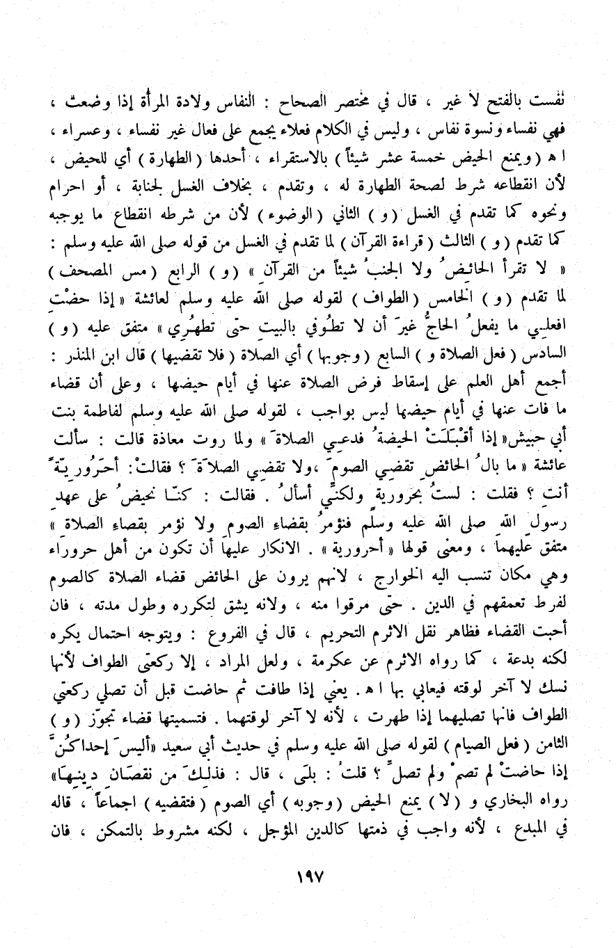 «سَأَلْتُ عَائِشَةَ مَا بَالُ الْحَائِضِ تَقْضِي الصَّوْمَ، وَلَا تَقْضِي الصَّلَاةَ؟ فَقَالَتْ: أَحَرُورِيَّةٌ أَنْتِ؟ فَقُلْتُ: لَسْتُ بِحَرُورِيَّةٍ وَلَكِنِّي أَسْأَلُ فَقَالَتْ: كُنَّا نَحِيضُ عَلَى عَهْدِ رَسُولِ اللَّهِ - صَلَّى اللَّهُ عَلَيْهِ وَسَلَّمَ - فَنُؤْمَرُ بِقَضَاءِ الصَّوْمِ وَلَا نُؤْمَرُ بِقَضَاءِ الصَّلَاةِ» مُتَّفَقٌ عَلَيْهِمَا،.