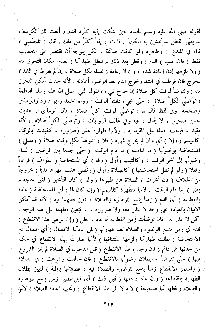 وَفِي لَفْظٍ قَالَ لَهَا تَوَضَّئِي لِوَقْتِ كُلِّ صَلَاةٍ قَالَ التِّرْمِذِيُّ: حَدِيثٌ حَسَنٌ صَحِيحٌ لَا يُقَالُ: فِيهِ وَفِي غَالِبِ الرِّوَايَاتِ وَتَوَضَّئِي لِكُلِّ صَلَاةٍ لِأَنَّهُ مُقَيَّدٌ فَيَجِبُ حَمْلُهُ عَلَى الْمُقَيَّدِ بِهِ وَلِأَنَّهَا طَهَارَةُ عُذْرٍ وَضَرُورَةٍ، فَتَقَيَّدَتْ بِالْوَقْتِ كَالتَّيَمُّمِ.