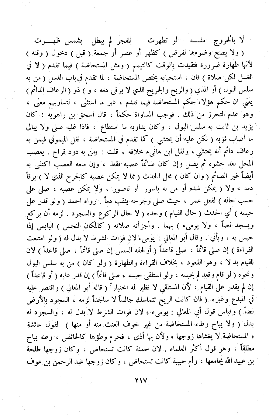 فَوَجَبَ الْمُسَاوَاةُ حُكْمًا، قَالَ إِسْحَاقُ بْنُ رَاهْوَيْهِ: كَانَ يَزِيدُ بْنُ ثَابِتٍ بِهِ سَلَسُ الْبَوْلِ، وَكَانَ يُدَاوِيهِ مَا اسْتَطَاعَ، فَإِذَا غَلَبَهُ صَلَّى وَلَا يُبَالِي مَا أَصَابَ ثَوْبَهُ (لَكِنْ عَلَيْهِ أَنْ يَحْتَشِيَ) كَمَا تَقَدَّمَ فِي الْمُسْتَحَاضَةِ، نَقَلَ الْمَيْمُونِيُّ فِيمَنْ بِهِ رُعَافٌ دَائِمٌ أَنَّهُ يَحْتَشِي، وَنَقَلَ ابْنُ هَانِئٍ خِلَافَهُ قُلْتُ وَمَنْ بِهِ دُودُ قِرَاحٍ يَعْصِبُ الْمَحَلَّ بَعْدَ حَشْوِهِ ثُمَّ يُصَلِّي وَإِنْ كَانَ صَائِمًا عَصَبَهُ فَقَطْ، وَإِنْ مَنَعَهُ الْعَصْبَ اكْتَفَى بِهِ أَيْضًا غَيْرُ الصَّائِمِ.