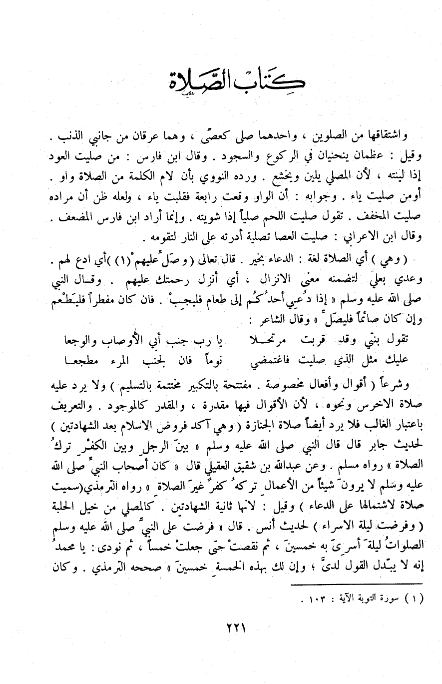 وَقَالَ ابْنُ الْأَعْرَابِيِّ: صَلَيْت الْعَصَا تَصْلِيَةً أَدَرْته عَلَى النَّارِ لِتُقَوِّمَهُ (وَهِيَ) أَيْ: الصَّلَاةُ لُغَةً الدُّعَاءُ بِخَيْرٍ قَالَ تَعَالَى {وَصَلِّ عَلَيْهِمْ} [التوبة: ١٠٣] أَيْ: اُدْعُ لَهُمْ وَعُدِّيَ بِعَلَى لِتَضَمُّنِهِ مَعْنَى الْإِنْزَالِ، أَيْ: أَنْزِلْ رَحْمَتَك عَلَيْهِمْ.