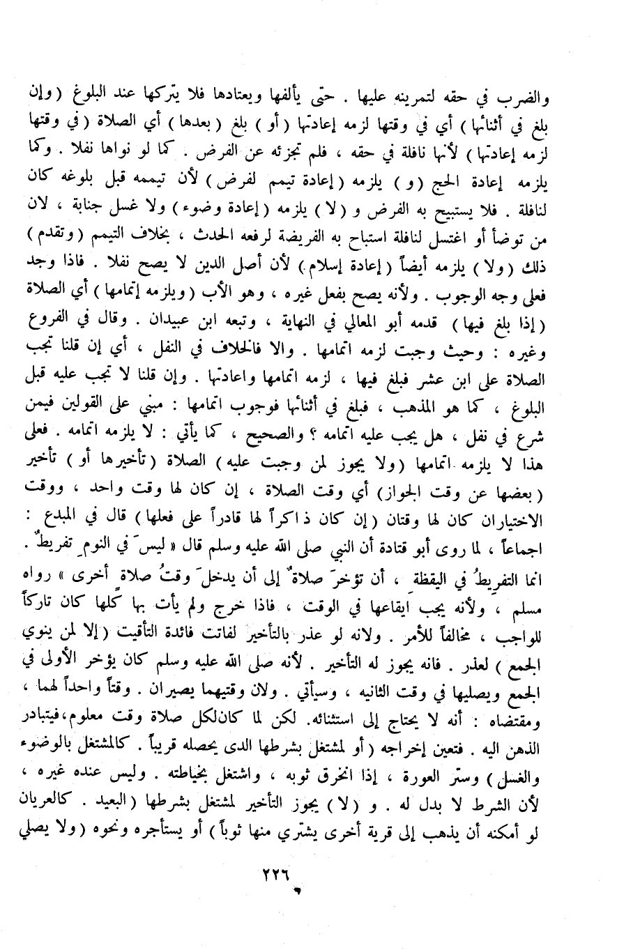 (وَإِنْ بَلَغَ فِي أَثْنَائِهَا) أَيْ: فِي وَقْتِهَا لَزِمَهُ إعَادَتُهَا (أَوْ) بَلَغَ (بَعْدَهَا) أَيْ الصَّلَاةِ (فِي وَقْتِهَا لَزِمَهُ إعَادَتُهَا) لِأَنَّهَا نَافِلَةٌ فِي حَقِّهِ، فَلَمْ تُجْزِئْهُ عَنْ الْفَرْضِ كَمَا لَوْ نَوَاهَا نَفْلًا وَكَمَا يَلْزَمُهُ إعَادَةُ الْحَجِّ (وَ) يَلْزَمُهُ (إعَادَةُ تَيَمُّمٍ لِفَرْضٍ) لِأَنَّ تَيَمُّمَهُ قَبْلَ بُلُوغِهِ كَانَ لِنَافِلَةٍ فَلَا يَسْتَبِيحُ بِهِ الْفَرْضَ (وَلَا) يَلْزَمُهُ إعَادَةُ (وُضُوءٍ) وَلَا غُسْلِ جَنَابَةٍ لِأَنَّ مَنْ تَوَضَّأَ أَوْ اغْتَسَلَ لِنَافِلَةٍ اسْتَبَاحَ بِهِ الْفَرِيضَةَ لِرَفْعِهِ الْحَدَثَ، بِخِلَافِ التَّيَمُّمِ (وَتَقَدَّمَ) ذَلِكَ (وَلَا) يَلْزَمُهُ أَيْضًا (إعَادَةُ إسْلَامٍ) لِأَنَّ أَصْلَ الدِّينِ لَا يَصِحُّ نَفْلًا فَإِذَا وُجِدَ فَعَلَى وَجْهِ الْوُجُوبِ وَلِأَنَّهُ يَصِحُّ بِفِعْلِ غَيْرِهِ وَهُوَ الْأَبُ (وَيَلْزَمُهُ إتْمَامُهَا) أَيْ الصَّلَاةِ (إذَا بَلَغَ فِيهَا) قَدَّمَهُ أَبُو الْمَعَالِي فِي النِّهَايَةِ، وَتَبِعَهُ ابْنُ عُبَيْدَانَ.