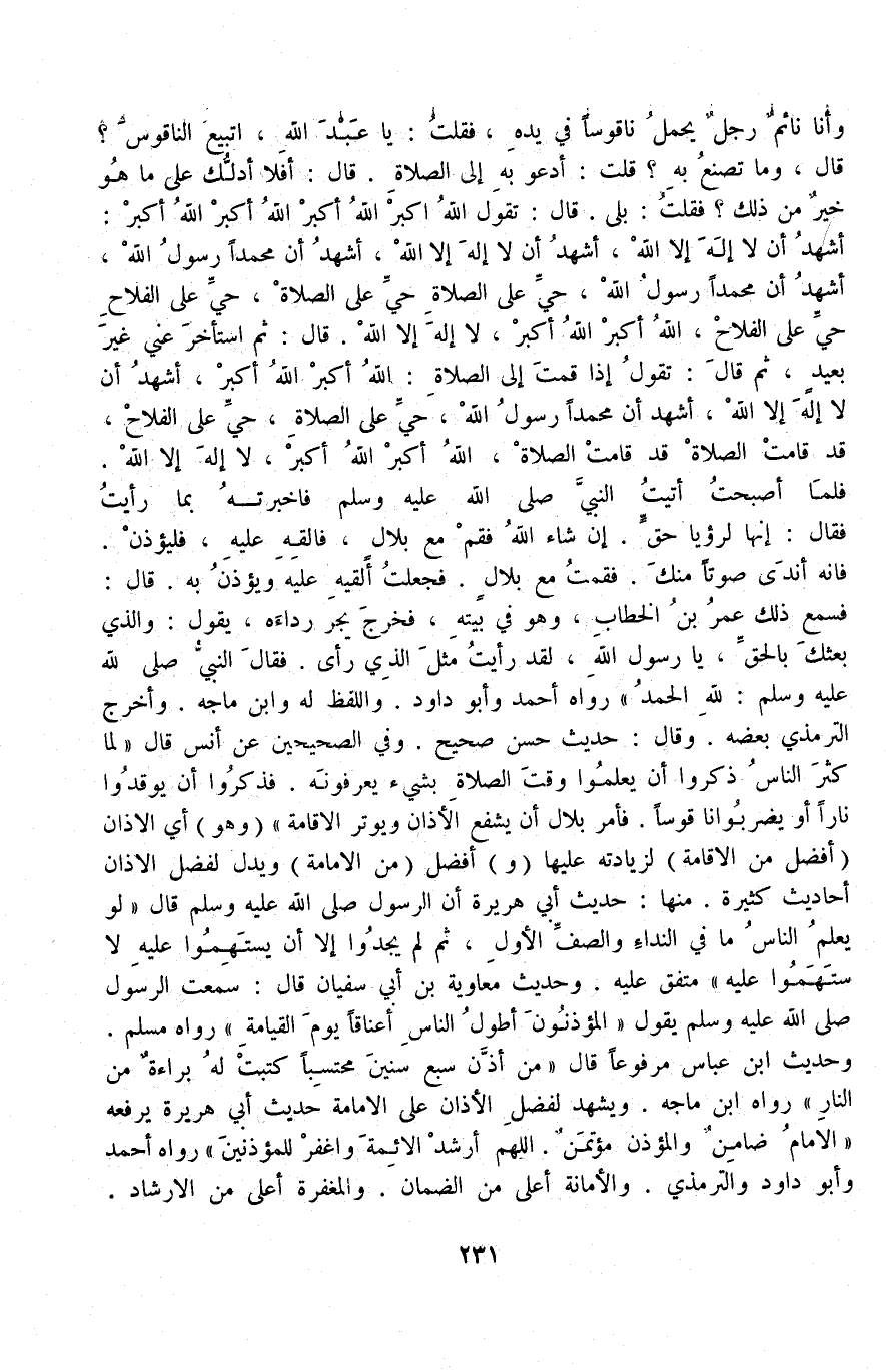 وَأَنَا نَائِمٌ رَجُلٌ يَحْمِلُ نَاقُوسًا فِي يَدِهِ، فَقُلْت: يَا عَبْدَ اللَّهِ أَتَبِيعُ النَّاقُوسَ؟ قَالَ وَمَا تَصْنَعُ بِهِ؟ قُلْت أَدْعُو بِهِ إلَى الصَّلَاةِ قَالَ: أَفَلَا أَدُلُّك عَلَى مَا هُوَ خَيْرٌ مِنْ ذَلِكَ؟ فَقُلْت بَلَى قَالَ: تَقُولُ: اللَّهُ أَكْبَرُ اللَّهُ أَكْبَرُ اللَّهُ أَكْبَرُ اللَّهُ أَكْبَرُ: أَشْهَدُ أَنْ لَا إلَهَ إلَّا اللَّهُ، أَشْهَدُ أَنْ لَا إلَهَ إلَّا اللَّهُ، أَشْهَدُ أَنَّ مُحَمَّدًا رَسُولُ اللَّهِ أَشْهَدُ أَنَّ مُحَمَّدًا رَسُولُ اللَّهِ حَيَّ عَلَى الصَّلَاةِ حَيَّ عَلَى الصَّلَاةِ، حَيَّ عَلَى الْفَلَاحِ حَيَّ عَلَى الْفَلَاحِ، اللَّهُ أَكْبَرُ اللَّهُ أَكْبَرُ، لَا إلَهَ إلَّا اللَّهُ. قَالَ: ثُمَّ اسْتَأْخَرَ عَنِّي غَيْرَ بَعِيدٍ، ثُمَّ قَالَ: تَقُولُ إذَا قُمْت إلَى الصَّلَاةِ: اللَّهُ أَكْبَرُ اللَّهُ أَكْبَرُ، أَشْهَدُ أَنْ لَا إلَهَ إلَّا اللَّهُ، أَشْهَدُ أَنَّ مُحَمَّدًا رَسُولُ اللَّهِ حَيَّ عَلَى الصَّلَاةِ، حَيَّ عَلَى الْفَلَاحِ، قَدْ قَامَتْ الصَّلَاةُ قَدْ قَامَتْ الصَّلَاةُ، اللَّهُ أَكْبَرُ اللَّهُ أَكْبَرُ، لَا إلَهَ إلَّا اللَّهُ فَلَمَّا أَصْبَحْت أَتَيْت النَّبِيَّ - صَلَّى اللَّهُ عَلَيْهِ وَسَلَّمَ - فَأَخْبَرْته بِمَا رَأَيْت فَقَالَ: إنَّهَا لَرُؤْيَا حَقٍّ إنْ شَاءَ اللَّهُ فَقُمْ مَعَ بِلَالٍ فَأَلْقِهِ عَلَيْهِ، فَلْيُؤَذِّنْ فَإِنَّهُ أَنْدَى صَوْتًا مِنْك فَقُمْت مَعَ بِلَالٍ فَجَعَلْت أُلْقِيهِ عَلَيْهِ وَيُؤَذِّنُ بِهِ قَالَ فَسَمِعَ ذَلِكَ عُمَرُ بْنُ الْخَطَّابِ وَهُوَ فِي بَيْتِهِ فَخَرَجَ يَجُرُّ رِدَاءَهُ، يَقُولُ: وَاَلَّذِي بَعَثَك بِالْحَقِّ، يَا رَسُولَ اللَّهِ، لَقَدْ رَأَيْت مِثْلَ الَّذِي رَأَى فَقَالَ النَّبِيُّ - صَلَّى اللَّهُ عَلَيْهِ وَسَلَّمَ -: لِلَّهِ الْحَمْدُ» رَوَاهُ أَحْمَدُ وَأَبُو دَاوُد وَاللَّفْظُ لَهُ وَابْنُ مَاجَهْ وَأَخْرَجَ التِّرْمِذِيُّ بَعْضَهُ وَقَالَ حَدِيثٌ حَسَنٌ صَحِيحٌ.