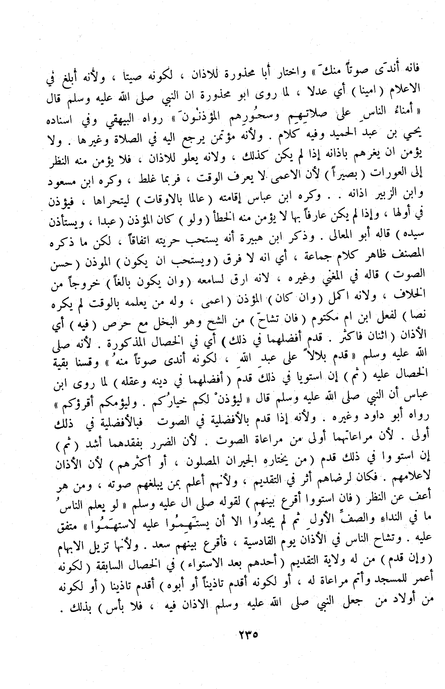فَإِنَّهُ أَنْدَى صَوْتًا مِنْك» وَاخْتَارَ أَبَا مَحْذُورَةَ لِلْأَذَانِ، لِكَوْنِهِ صَيِّتًا، وَلِأَنَّهُ أَبْلَغُ فِي الْإِعْلَامِ (أَمِينًا) أَيْ: عَدْلًا، لِمَا رَوَى أَبُو مَحْذُورَةَ أَنَّ النَّبِيَّ - صَلَّى اللَّهُ عَلَيْهِ وَسَلَّمَ - قَالَ «أُمَنَاءُ النَّاسِ عَلَى صَلَاتِهِمْ وَسُحُورِهِمْ الْمُؤَذِّنُونَ» رَوَاهُ الْبَيْهَقِيُّ.