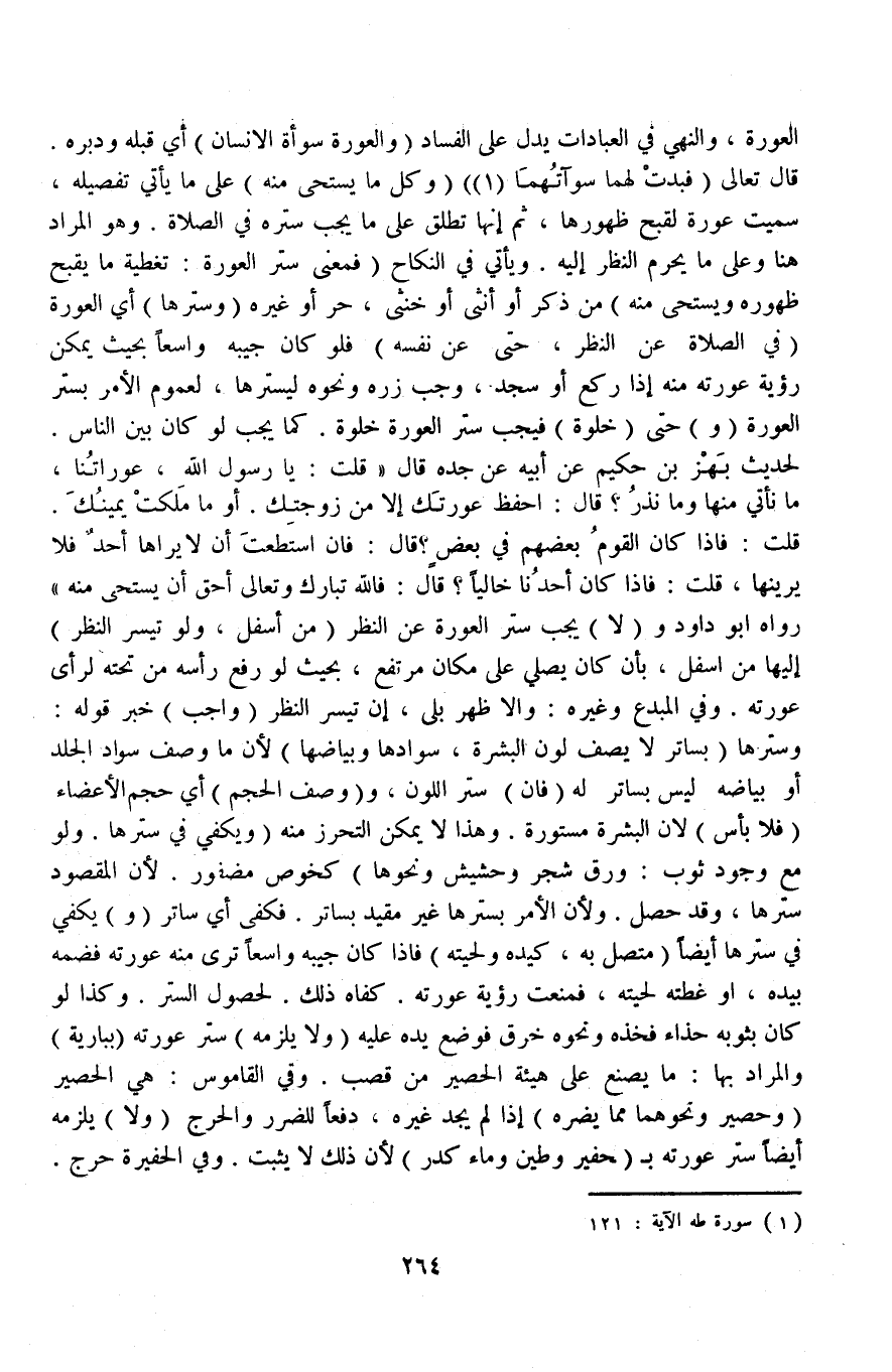 (وَالْعَوْرَةُ سَوْأَةُ الْإِنْسَانِ) أَيْ: قُبُلُهُ وَدُبُرُهُ قَالَ تَعَالَى {فَبَدَتْ لَهُمَا سَوْآتُهُمَا} [طه: ١٢١] (وَكُلُّ مَا يُسْتَحَى مِنْهُ) عَلَى مَا يَأْتِي تَفْصِيلُهُ، سُمِّيَتْ عَوْرَةً لِقُبْحِ ظُهُورِهَا، ثُمَّ إنَّهَا تُطْلَقُ عَلَى مَا يَجِبُ سَتْرُهُ فِي الصَّلَاةِ وَهُوَ الْمُرَادُ هُنَا وَعَلَى مَا يَحْرُمُ النَّظَرُ إلَيْهِ وَيَأْتِي فِي النِّكَاحِ (فَمَعْنَى سَتْرِ الْعَوْرَةِ تَغْطِيَةُ مَا يَقْبُحُ ظُهُورُهُ وَيُسْتَحَى مِنْهُ) مِنْ ذَكَرٍ أَوْ أُنْثَى أَوْ خُنْثَى حُرٍّ أَوْ غَيْرِهِ (وَسَتْرُهَا) أَيْ: الْعَوْرَةِ (فِي الصَّلَاةِ عَنْ النَّظَرِ، حَتَّى عَنْ نَفْسِهِ) .
