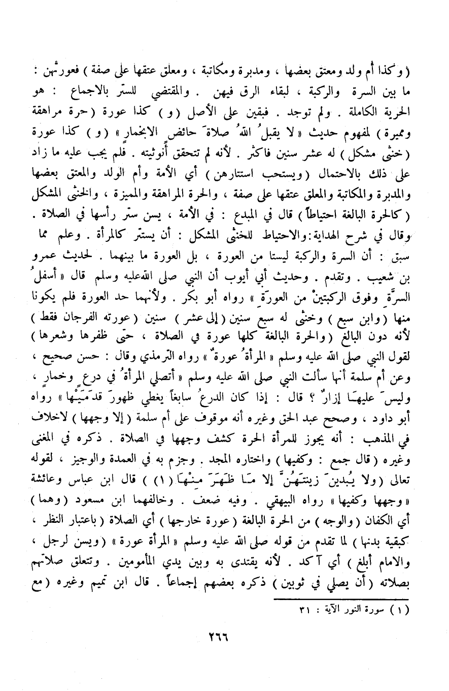 (وَكَذَا أُمُّ وَلَدٍ وَمُعْتَقٌ بَعْضُهَا، وَمُدَبَّرَةٌ، وَمُكَاتَبَةٌ، وَمُعَلَّقٌ عِتْقُهَا عَلَى صِفَةٍ) فَعَوْرَتُهُنَّ: مَا بَيْنَ السُّرَّةِ وَالرُّكْبَةِ، لِبَقَاءِ الرِّقِّ فِيهِنَّ وَالْمُقْتَضِي لِلسَّتْرِ بِالْإِجْمَاعِ هُوَ الْحُرِّيَّةُ الْكَامِلَةُ وَلَمْ تُوجَدْ فَبَقِينَ عَلَى الْأَصْلِ (وَ) كَذَا عَوْرَةُ (حُرَّةٍ مُرَاهِقَةٍ وَمُمَيِّزَةٍ) لِمَفْهُومِ حَدِيثِ «لَا يَقْبَلُ اللَّهُ صَلَاةَ حَائِضٍ إلَّا بِخِمَارٍ» (وَ) كَذَا عَوْرَةُ (خُنْثَى مُشْكِلٍ) لَهُ عَشْرُ سِنِينَ فَأَكْثَرُ لِأَنَّهُ لَمْ تَتَحَقَّقْ أُنُوثِيَّتُهُ فَلَمْ يَجِبْ عَلَيْهِ مَا زَادَ عَلَى ذَلِكَ بِالِاحْتِمَالِ.