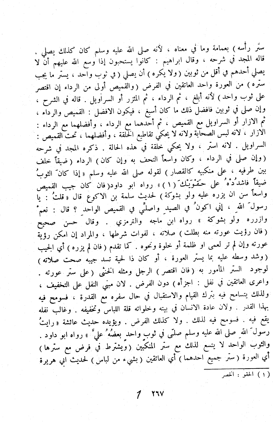 (وَلَا يُكْرَهُ) أَنْ يُصَلِّيَ (فِي ثَوْبٍ وَاحِدٍ يَسْتُرُ مَا يَجِبُ سَتْرُهُ) مِنْ الْعَوْرَةِ وَأَحَدِ الْعَاتِقَيْنِ فِي الْفَرْضِ (وَالْقَمِيصُ أَوْلَى مِنْ الرِّدَاءِ إنْ اقْتَصَرَ عَلَى ثَوْبٍ وَاحِدٍ) لِأَنَّهُ أَبْلَغُ، ثُمَّ الرِّدَاءُ ثُمَّ الْمِئْزَرُ أَوْ السَّرَاوِيلُ قَالَهُ فِي الشَّرْحِ، وَإِنْ صَلَّى فِي ثَوْبَيْنِ فَأَفْضَلُ ذَلِكَ مَا كَانَ أَسْبَغَ، فَيَكُونُ الْأَفْضَلُ: الْقَمِيصَ وَالرِّدَاءَ، ثُمَّ الْإِزَارَ أَوْ السَّرَاوِيلَ مَعَ الْقَمِيصِ، ثُمَّ أَحَدَهُمَا مَعَ الرِّدَاءِ، وَأَفْضَلُهُمَا مَعَ الرِّدَاءِ: الْإِزَارُ، لِأَنَّهُ لُبْسُ الصَّحَابَةِ وَلِأَنَّهُ لَا يَحْكِي تَقَاطِيعَ الْخِلْقَةِ، وَأَفْضَلُهُمَا، تَحْتَ الْقَمِيصِ: السَّرَاوِيلُ لِأَنَّهُ أَسْتَرُ، وَلَا يَحْكِي خِلْقَةً فِي هَذِهِ الْحَالَةِ ذَكَرَهُ الْمَجْدُ فِي شَرْحِهِ.