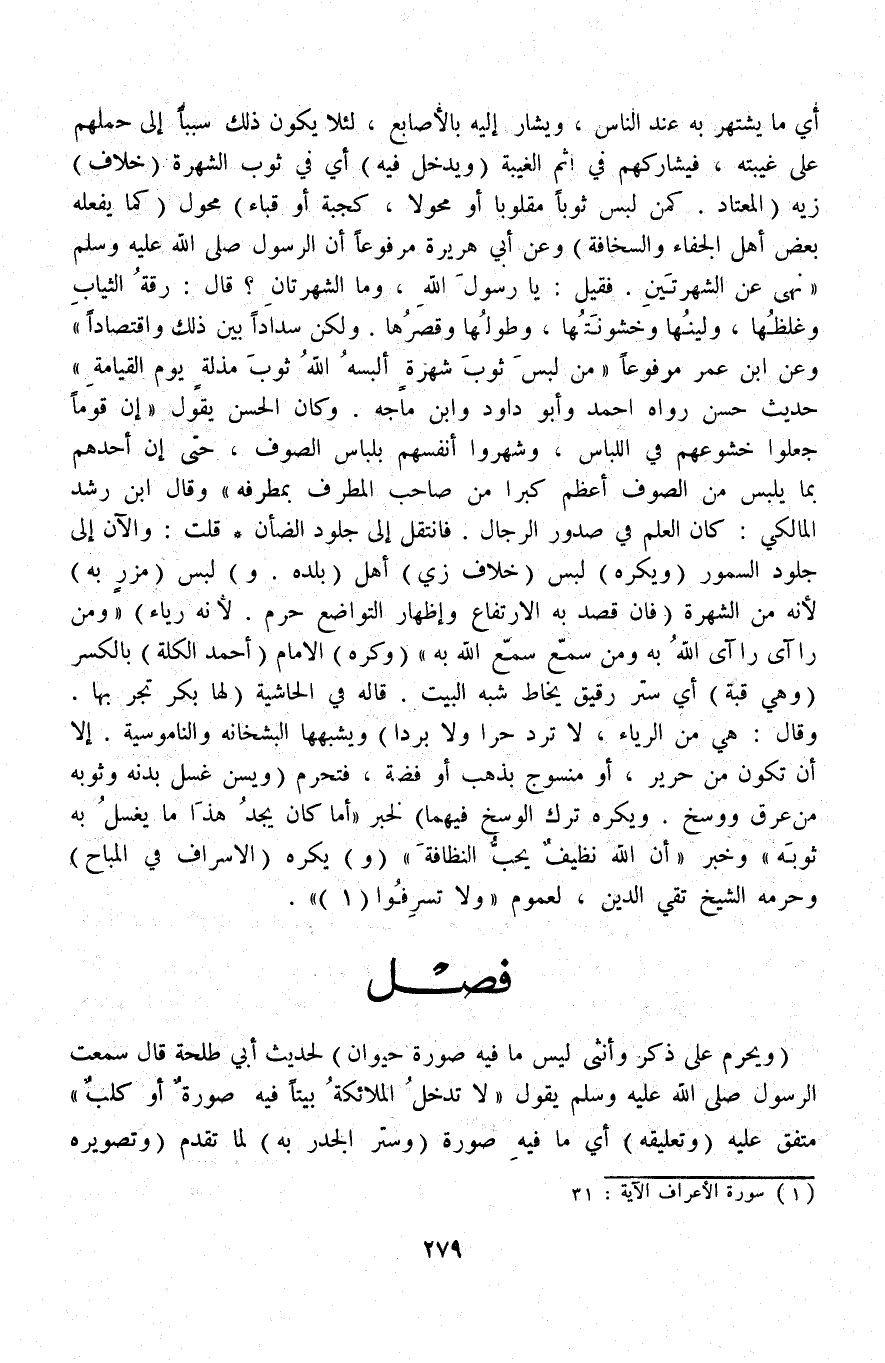 فَصْلٌ (وَيَحْرُمُ عَلَى ذَكَرٍ وَأُنْثَى لُبْسُ مَا فِيهِ صُورَةُ حَيَوَانٍ) لِحَدِيثِ أَبِي طَلْحَةَ قَالَ سَمِعْتُ، الرَّسُولَ - صَلَّى اللَّهُ عَلَيْهِ وَسَلَّمَ - يَقُولُ «لَا تَدْخُلُ الْمَلَائِكَةُ بَيْتًا فِيهِ صُورَةٌ أَوْ كَلْبٌ» مُتَّفَقٌ عَلَيْهِ (وَتَعْلِيقُهُ) أَيْ: مَا فِيهِ صُورَةٌ (وَسَتْرُ الْجُدُرِ بِهِ) لِمَا تَقَدَّمَ (وَتَصْوِيرُهُ