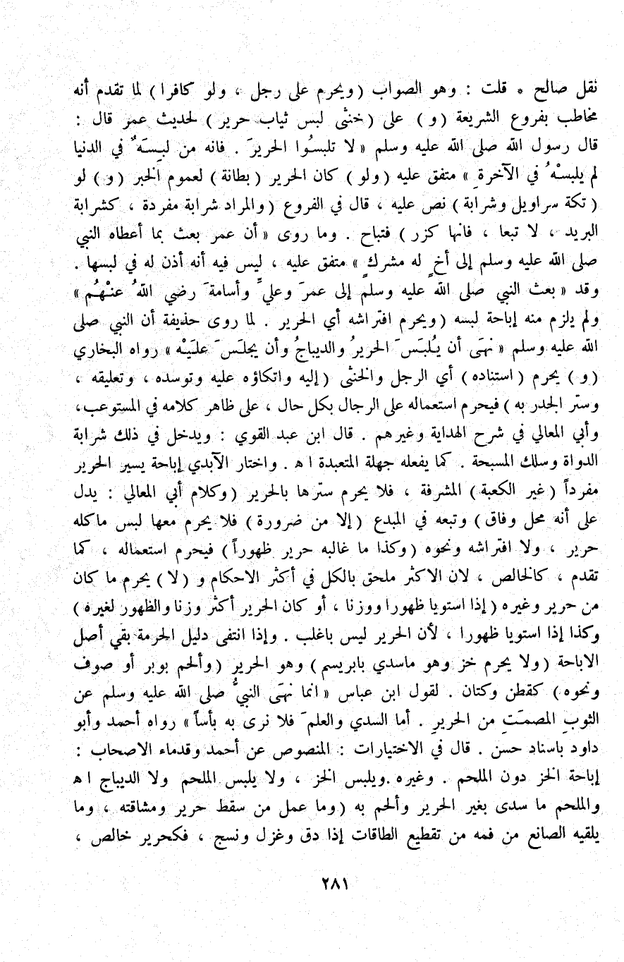 نَقْلِ صَالِحٍ قُلْتُ: وَهُوَ الصَّوَابُ (وَيَحْرُمُ عَلَى رَجُلٍ وَلَوْ كَافِرًا) لِمَا تَقَدَّمَ أَنَّهُ مُخَاطَبٌ بِفُرُوعِ الشَّرِيعَةِ.