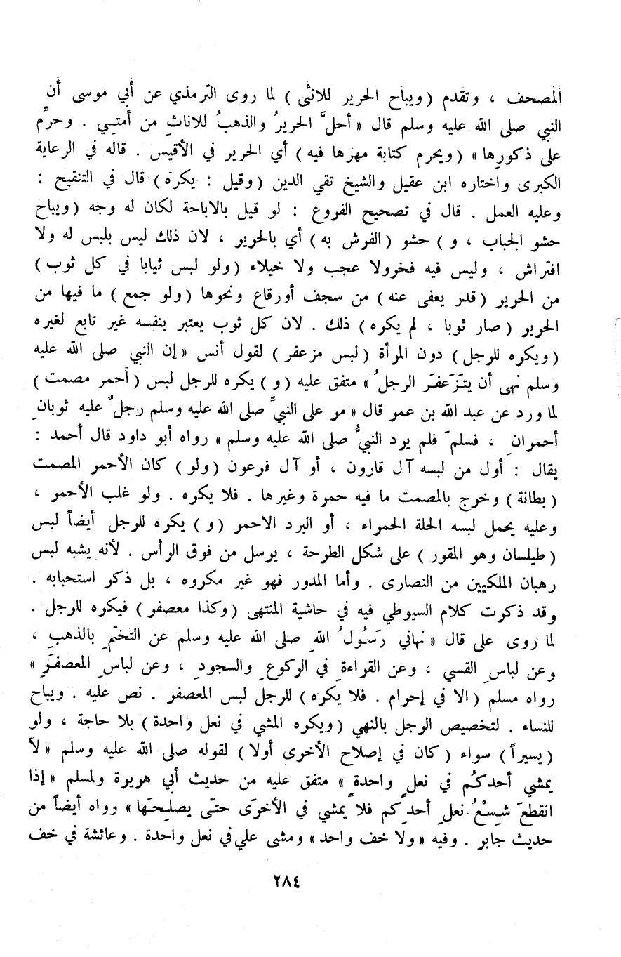 (وَ) يُكْرَهُ لِلرَّجُلِ لُبْسُ (أَحْمَرَ مُصْمَتٍ) لِمَا وَرَدَ عَنْ عَبْدِ اللَّهِ بْنِ عُمَرَ قَالَ «مَرَّ عَلَى النَّبِيِّ - صَلَّى اللَّهُ عَلَيْهِ وَسَلَّمَ - رَجُلٌ عَلَيْهِ ثَوْبَانِ أَحْمَرَانِ، فَسَلَّمَ فَلَمْ يَرُدَّ النَّبِيُّ - صَلَّى اللَّهُ عَلَيْهِ وَسَلَّمَ -» رَوَاهُ أَبُو دَاوُد قَالَ أَحْمَدُ يُقَالُ: أَوَّلُ مَنْ لَبِسَهُ آلُ قَارُونَ أَوْ آلُ فِرْعَوْنَ (وَلَوْ) كَانَ الْأَحْمَرُ الْمُصْمَتُ (بِطَانَةً) وَخَرَجَ بِالْمُصْمَتِ مَا فِيهِ حُمْرَةٌ وَغَيْرُهَا فَلَا يُكْرَهُ وَلَوْ غَلَبَ الْأَحْمَرُ، وَعَلَيْهِ يُحْمَلُ لُبْسُهُ الْحُلَّةَ الْحَمْرَاءَ، أَوْ الْبُرْدَ الْأَحْمَرَ.
