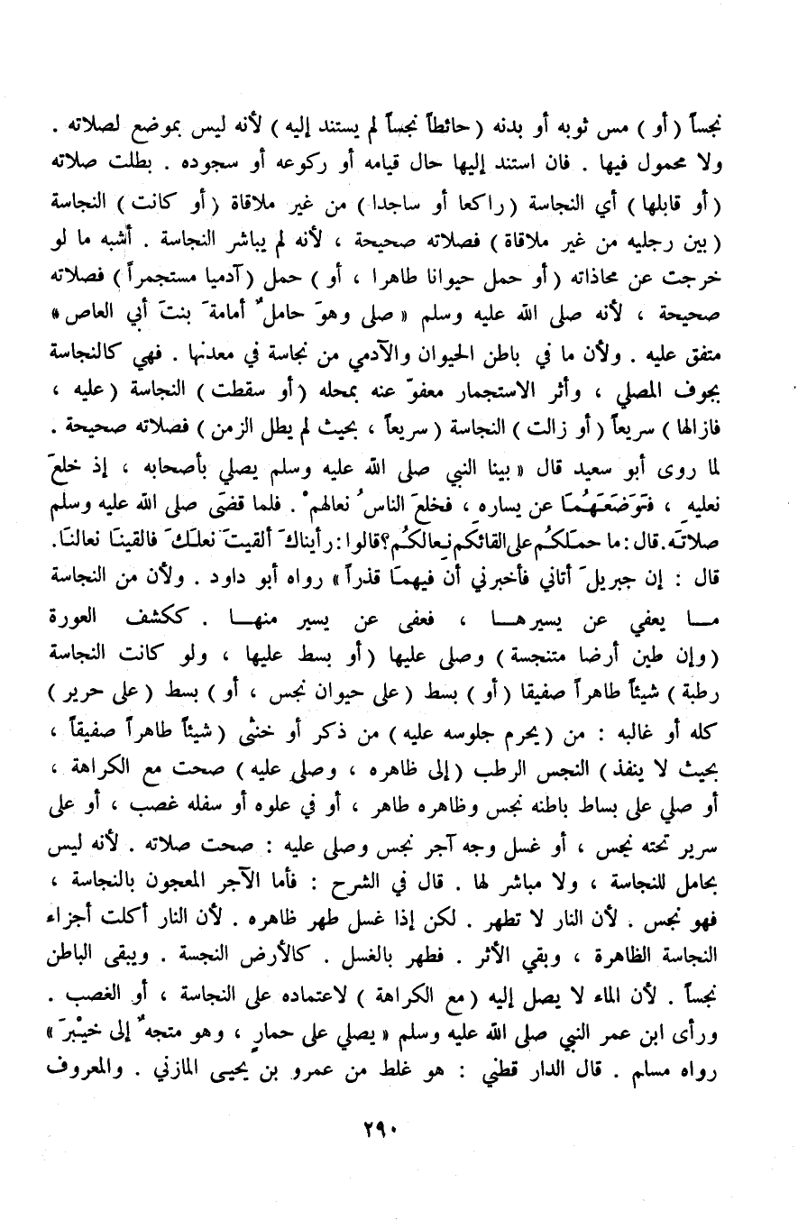 وَلَا مَحْمُولَ فِيهَا فَإِنْ اسْتَنَدَ إلَيْهَا حَالَ قِيَامِهِ أَوْ رُكُوعِهِ أَوْ سُجُودِهِ بَطِلَتْ صَلَاتُهُ (أَوْ قَابَلَهَا) أَيْ: النَّجَاسَةَ (رَاكِعًا أَوْ سَاجِدًا) مِنْ غَيْرِ مُلَاقَاةٍ (أَوْ كَانَتْ) النَّجَاسَةُ (بَيْنَ رِجْلَيْهِ مِنْ غَيْرِ مُلَاقَاةٍ) فَصَلَاتُهُ صَحِيحَةٌ، لِأَنَّهُ لَمْ يُبَاشِرْ النَّجَاسَةَ أَشْبَهَ مَا لَوْ خَرَجَتْ عَنْ مُحَاذَاتِهِ (أَوْ حَمَلَ حَيَوَانًا طَاهِرًا، أَوْ) حَمَلَ (آدَمِيًّا مُسْتَجْمِرًا) فَصَلَاتُهُ صَحِيحَةٌ، لِأَنَّهُ - صَلَّى اللَّهُ عَلَيْهِ وَسَلَّمَ - «صَلَّى وَهُوَ حَامِلٌ أُمَامَةَ بِنْتَ أَبِي الْعَاصِ» مُتَّفَقٌ عَلَيْهِ وَلِأَنَّ مَا فِي بَاطِنِ الْحَيَوَانِ وَالْآدَمِيِّ مِنْ نَجَاسَةٍ فِي مَعْدِنِهَا فَهِيَ كَالنَّجَاسَةِ بِجَوْفِ الْمُصَلِّي، وَأَثَرُ الِاسْتِجْمَارِ مَعْفُوٌّ عَنْهُ بِمَحَلِّهِ (أَوْ سَقَطَتْ) النَّجَاسَةُ (عَلَيْهِ، فَأَزَالَهَا) سَرِيعًا (أَوْ زَالَتْ) النَّجَاسَةُ (سَرِيعًا، بِحَيْثُ لَمْ يَطُلْ الزَّمَنُ) فَصَلَاتُهُ صَحِيحَةٌ.