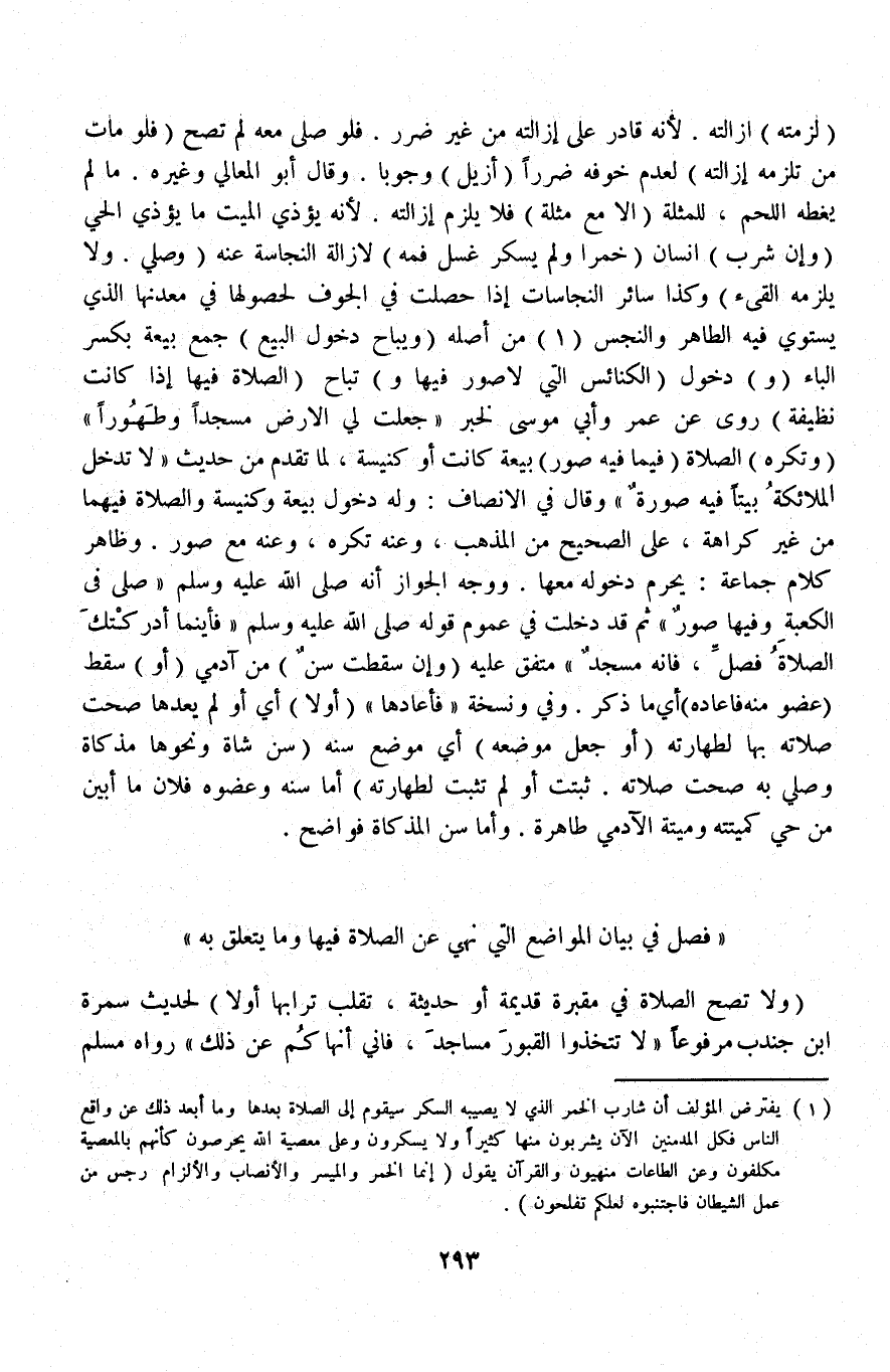 ِ (وَلَا تَصِحُّ الصَّلَاةُ فِي مَقْبَرَةٍ قَدِيمَةٍ أَوْ حَدِيثَةٍ، تَقَلَّبَ تُرَابُهَا أَوْ لَا) لِحَدِيثِ سَمُرَةَ بْنِ جُنْدَبٍ مَرْفُوعًا «لَا تَتَّخِذُوا الْقُبُورَ مَسَاجِدَ، فَإِنِّي أَنْهَاكُمْ عَنْ ذَلِكَ» رَوَاهُ مُسْلِمٌ