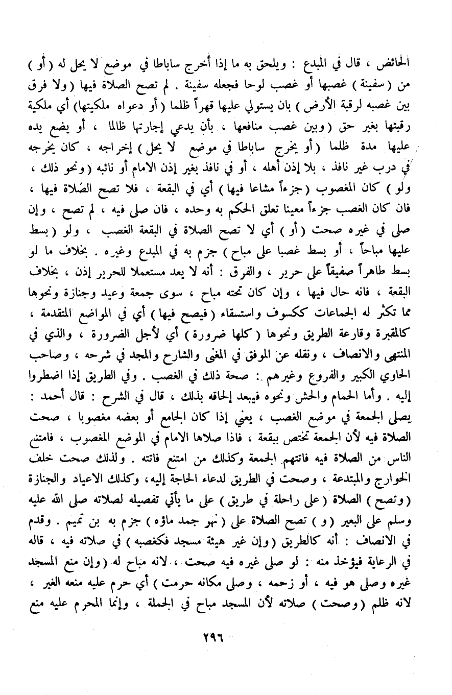 (وَنَحْوِ ذَلِكَ، وَلَوْ) كَانَ الْمَغْصُوبُ (جُزْءًا مُشَاعًا فِيهَا) أَيْ: فِي الْبُقْعَةِ، فَلَا تَصِحُّ الصَّلَاةُ فِيهَا، فَإِنْ كَانَ الْغَصْبُ جُزْءًا مُعَيَّنًا تَعَلَّقَ الْحُكْمُ بِهِ وَحْدَهُ، فَإِنْ صَلَّى فِيهِ، لَمْ تَصِحَّ، وَإِنْ صَلَّى فِي غَيْرِهِ صَحَّتْ (أَوْ) أَيْ: لَا تَصِحَّ الصَّلَاةُ فِي الْبُقْعَةِ الْغَصْبِ، وَلَوْ (بَسَطَ عَلَيْهَا مُبَاحًا، أَوْ بَسَطَ غَصْبًا عَلَى مُبَاحٍ) جُزِمَ بِهِ فِي الْمُبْدِعِ وَغَيْرِهِ بِخِلَافِ مَا لَوْ بَسَطَ طَاهِرًا صَفِيقًا عَلَى حَرِيرٍ وَالْفَرْقُ: أَنَّهُ لَا يُعَدُّ مُسْتَعْمِلًا لِلْحَرِيرِ إذْنَ بِخِلَافِ الْبُقْعَةِ، فَإِنَّهُ حَالٌ فِيهَا، وَإِنْ كَانَ تَحْتَهُ مُبَاحٌ (سِوَى جُمُعَةٍ وَعِيدٍ وَجِنَازَةٍ وَنَحْوِهَا مِمَّا تَكْثُرُ لَهُ الْجَمَاعَاتُ) كَكُسُوفٍ وَاسْتِسْقَاءٍ (فَيَصِحُّ فِيهَا) أَيْ فِي الْمَوَاضِعِ الْمُتَقَدِّمَةِ، كَالْمَقْبَرَةِ وَقَارِعَةِ الطَّرِيقِ وَنَحْوِهَا (كُلِّهَا ضَرُورَةً) أَيْ: لِأَجْلِ الضَّرُورَةِ.
