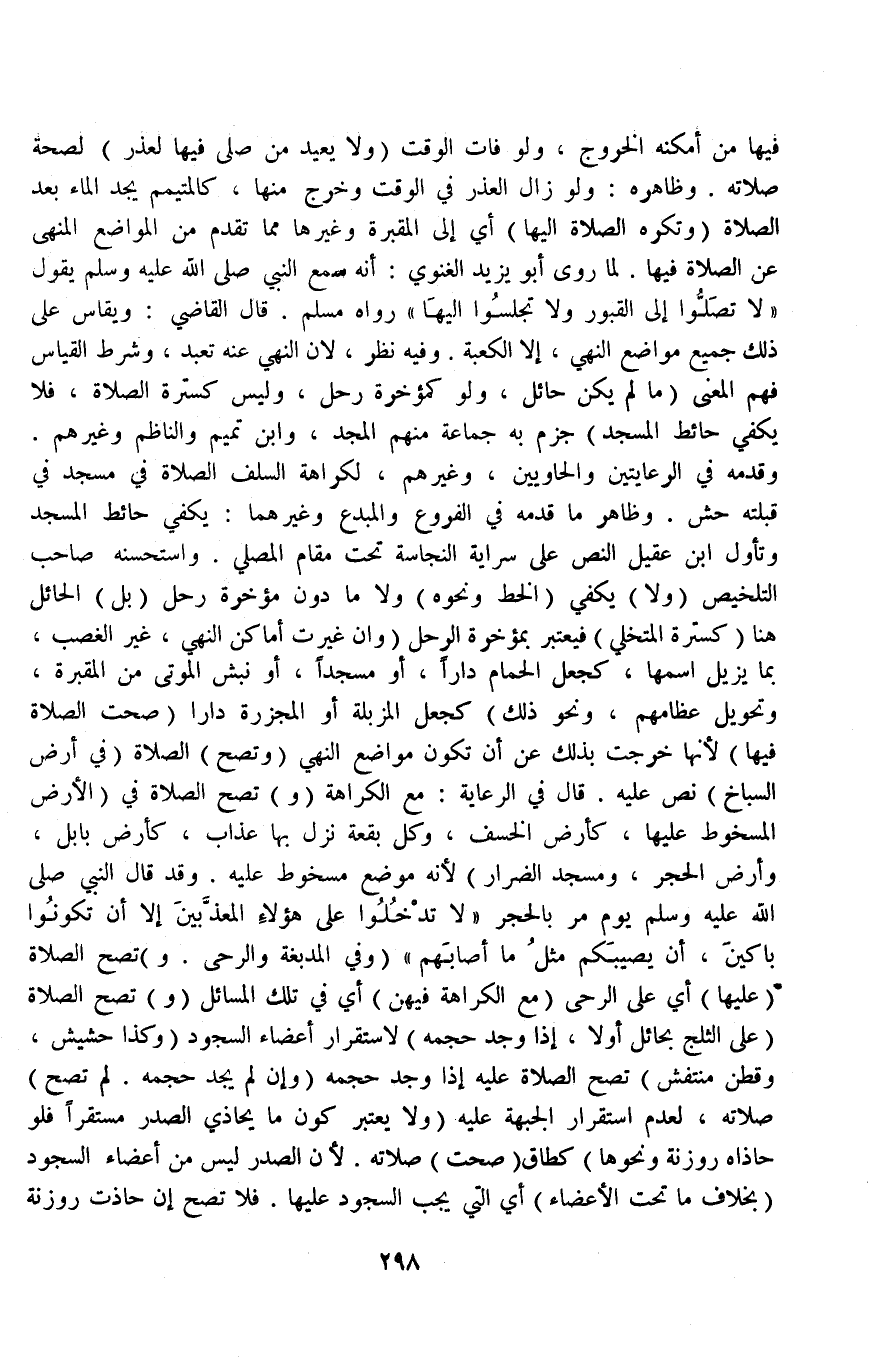 فِيهَا مَنْ أَمْكَنَهُ الْخُرُوجُ، وَلَوْ فَاتَ الْوَقْتُ (وَلَا يُعِيدُ) مَنْ صَلَّى فِيهَا لِعُذْرٍ لِصِحَّةِ صَلَاتِهِ وَظَاهِرُهُ: وَلَوْ زَالَ الْعُذْرُ فِي الْوَقْتِ وَخَرَجَ مِنْهَا، كَالْمُتَيَمِّمِ يَجِدُ الْمَاءَ بَعْدَ الصَّلَاةِ (وَتُكْرَهُ الصَّلَاةُ إلَيْهَا) أَيْ: إلَى الْمَقْبَرَةِ وَغَيْرِهَا مِمَّا تَقَدَّمَ مِنْ الْمَوَاضِعِ الْمَنْهِيِّ عَنْ الصَّلَاةِ فِيهَا لِمَا رَوَى أَبُو يَزِيدَ الْغَنَوِيُّ: أَنَّهُ سَمِعَ النَّبِيَّ - صَلَّى اللَّهُ عَلَيْهِ وَسَلَّمَ - يَقُولُ «لَا تُصَلُّوا إلَى الْقُبُورِ وَلَا تَجْلِسُوا إلَيْهَا» رَوَاهُ مُسْلِمٌ قَالَ الْقَاضِي: وَيُقَاسُ عَلَى ذَلِكَ جَمِيعُ مَوَاضِعَ النَّهْيِ، إلَّا الْكَعْبَةَ.