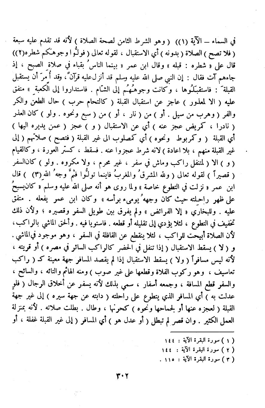 (وَهُوَ الشَّرْطُ الثَّامِنُ لِصِحَّةِ الصَّلَاةِ) لِأَنَّهُ قَدْ تَقَدَّمَ عَلَيْهِ سَبْعَةٌ (فَلَا تَصِحُّ) الصَّلَاةُ (بِدُونِهِ) أَيْ الِاسْتِقْبَالِ، لِقَوْلِهِ تَعَالَى {فَوَلُّوا وُجُوهَكُمْ شَطْرَهُ} [البقرة: ١٤٤] قَالَ عَلِيٌّ ": شَطْرُهُ قِبَلُهُ وَقَالَ ابْنُ عُمَرَ: «بَيْنَمَا النَّاسُ بِقُبَاءَ فِي صَلَاةِ الصُّبْحِ إذْ جَاءَهُمْ آتٍ فَقَالَ: إنَّ النَّبِيَّ - صَلَّى اللَّهُ عَلَيْهِ وَسَلَّمَ - قَدْ أُنْزِلَ عَلَيْهِ قُرْآنٌ وَقَدْ أُمِرَ أَنْ يَسْتَقْبِلَ الْقِبْلَةَ فَاسْتَقْبِلُوهَا، وَكَانَتْ وُجُوهُهُمْ إلَى الشَّامِ فَاسْتَدَارُوا إلَى الْكَعْبَةِ» مُتَّفَقٌ عَلَيْهِ.