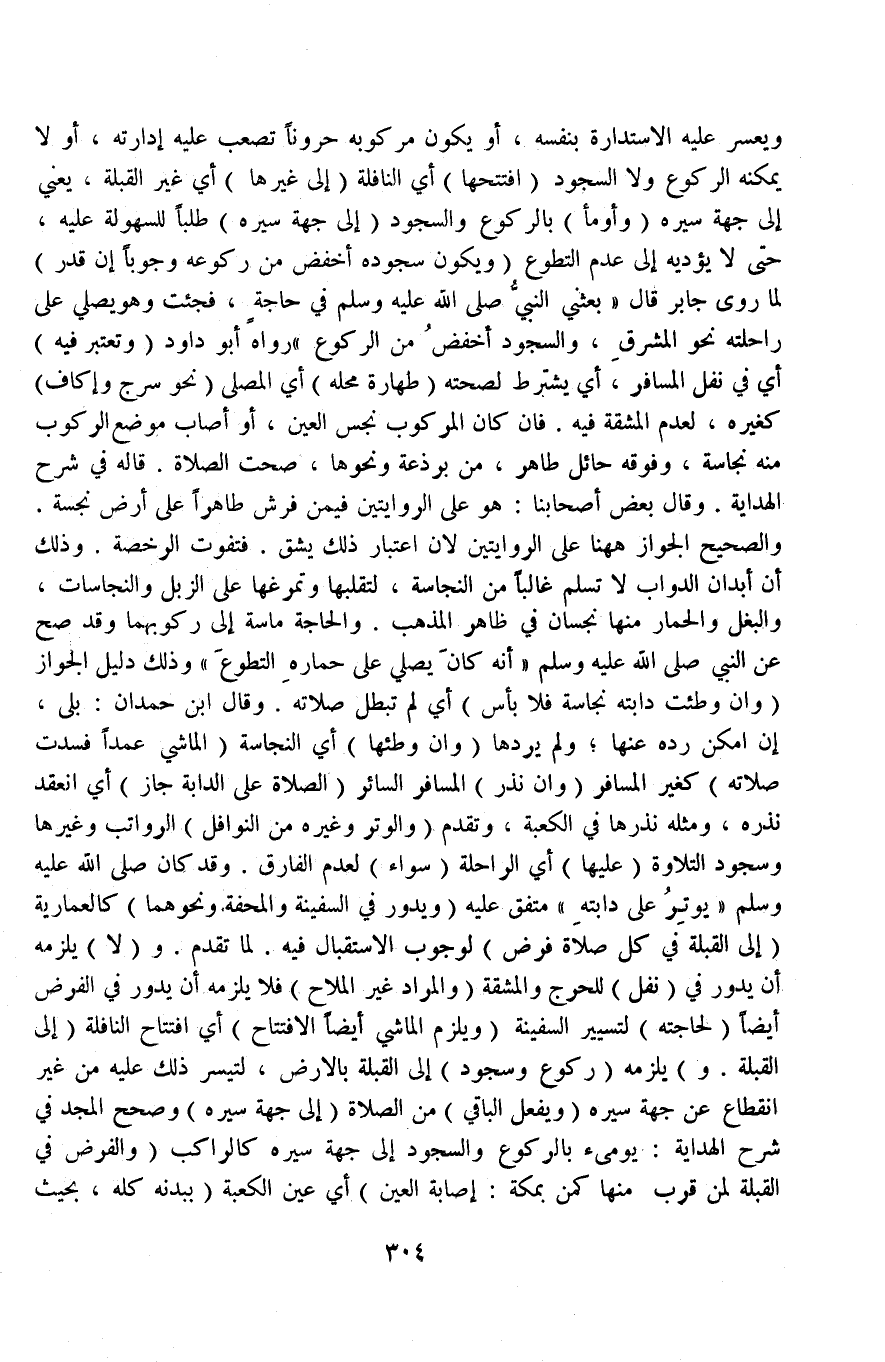 وَيَعْسُرُ عَلَيْهِ الِاسْتِدَارَةُ بِنَفْسِهِ، أَوْ يَكُونُ مَرْكُوبُهُ حَرُونًا تَصْعُبُ عَلَيْهِ إدَارَتُهُ، أَوْ لَا يُمْكِنُهُ الرُّكُوعُ وَلَا السُّجُودُ (افْتَتَحَهَا) أَيْ النَّافِلَةَ (إلَى غَيْرِهَا) أَيْ غَيْرِ الْقِبْلَةِ يَعْنِي إلَى جِهَةِ سَيْرِهِ (وَأَوْمَأَ) بِالرُّكُوعِ وَالسُّجُودِ (إلَى جِهَةِ سَيْرِهِ) طَلَبًا لِلسُّهُولَةِ عَلَيْهِ، حَتَّى لَا يُؤَدِّيهِ إلَى عَدَمِ التَّطَوُّعِ (وَيَكُونُ سُجُودُهُ أَخْفَضَ مِنْ رُكُوعِهِ وُجُوبًا إنْ قَدِرَ) لِمَا رَوَى جَابِرٌ قَالَ «بَعَثَنِي النَّبِيُّ - صَلَّى اللَّهُ عَلَيْهِ وَسَلَّمَ - فِي حَاجَةٍ فَجِئْتُ وَهُوَ يُصَلِّي عَلَى رَاحِلَتِهِ نَحْوَ الْمَشْرِقِ، وَالسُّجُودُ أَخْفَضُ مِنْ الرُّكُوعِ» رَوَاهُ أَبُو دَاوُد.