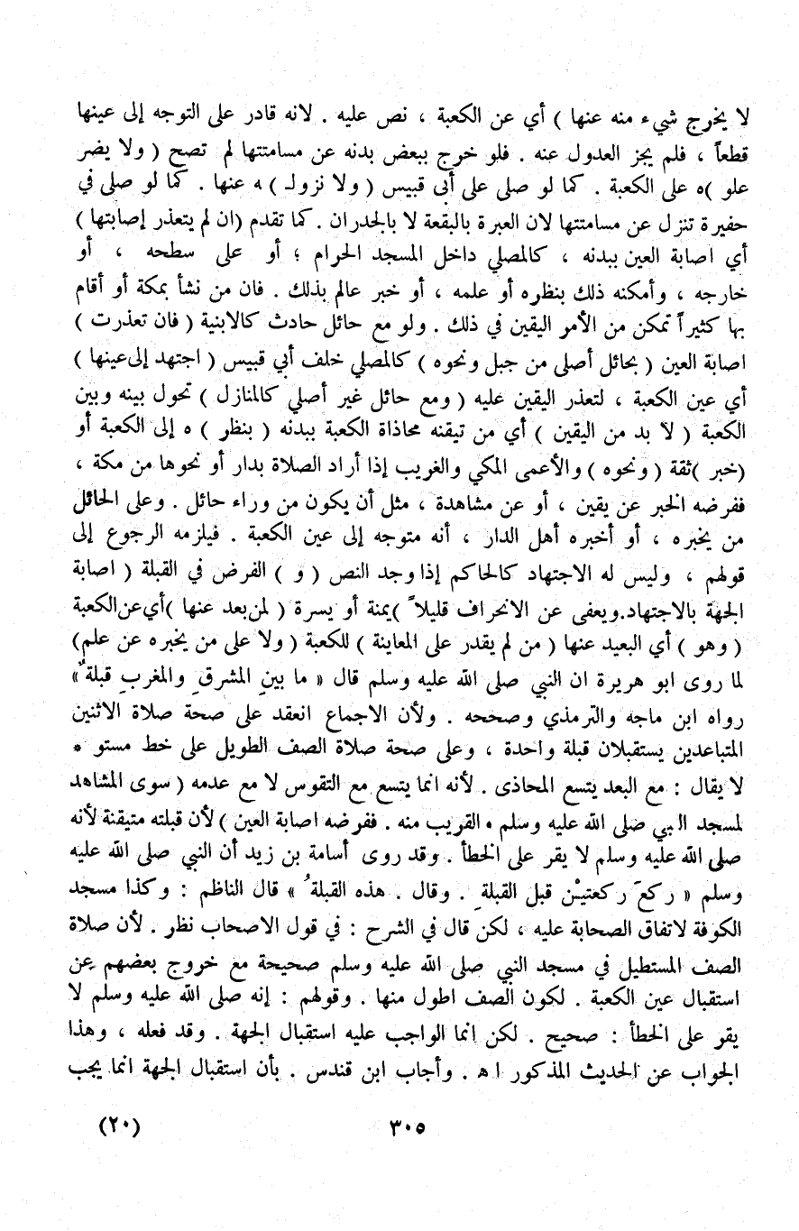 وَقَدْ رَوَى أُسَامَةُ بْنُ زَيْدٍ أَنَّ النَّبِيَّ - صَلَّى اللَّهُ عَلَيْهِ وَسَلَّمَ - «رَكَعَ رَكْعَتَيْنِ قِبَلَ الْقِبْلَةِ وَقَالَ: هَذِهِ الْقِبْلَةُ» قَالَ النَّاظِمُ: وَكَذَا مَسْجِدُ الْكُوفَةِ لِاتِّفَاقِ الصَّحَابَةِ عَلَيْهِ، لَكِنْ قَالَ فِي الشَّرْحِ: فِي قَوْلِ الْأَصْحَابِ نَظَرٌ لِأَنَّ صَلَاةَ الصَّفِّ الْمُسْتَطِيلِ فِي مَسْجِدِ النَّبِيِّ - صَلَّى اللَّهُ عَلَيْهِ وَسَلَّمَ - صَحِيحَةٌ مَعَ خُرُوجِ بَعْضِهِمْ عَنْ اسْتِقْبَالِ عَيْنِ الْكَعْبَةِ لِكَوْنِ الصَّفِّ أَطْوَلُ مِنْهَا وَقَوْلُهُمْ: إنَّهُ - صَلَّى اللَّهُ عَلَيْهِ وَسَلَّمَ - لَا يُقِرُّ عَلَى الْخَطَأِ: صَحِيحٌ لَكِنْ إنَّمَا الْوَاجِبُ عَلَيْهِ اسْتِقْبَالُ الْجِهَةِ وَقَدْ فَعَلَهُ، وَهَذَا الْجَوَابِ عَنْ الْحَدِيثِ الْمَذْكُورِ اهـ.