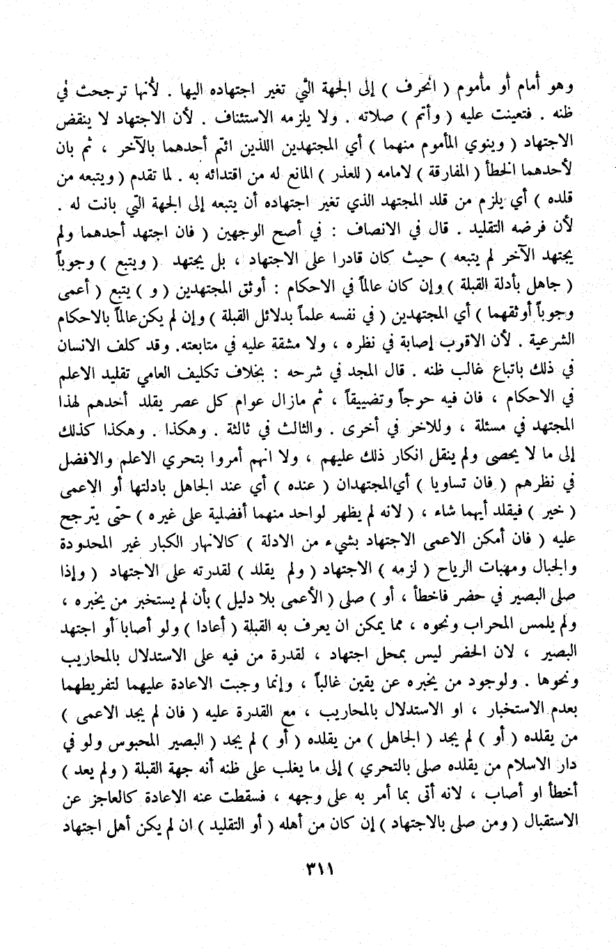 وَهُوَ إمَامٌ أَوْ مَأْمُومٌ (انْحَرَفَ) إلَى الْجِهَةِ الَّتِي تَغَيَّرَ اجْتِهَادُهُ إلَيْهَا لِأَنَّهَا تَرَجَّحَتْ فِي ظَنِّهِ فَتَعَيَّنَتْ عَلَيْهِ (وَأَتَمَّ) صَلَاتَهُ وَلَا يَلْزَمُهُ الِاسْتِئْنَافُ لِأَنَّ الِاجْتِهَادَ لَا يَنْقُضُ الِاجْتِهَادَ (وَيَنْوِي الْمَأْمُومُ مِنْهُمَا) أَيْ الْمُجْتَهِدِينَ اللَّذَيْنِ ائْتَمَّ أَحَدُهُمَا بِالْآخَرِ، ثُمَّ بَانَ لِأَحَدِهِمَا الْخَطَأُ (الْمُفَارَقَةَ) لِإِمَامِهِ (لِلْعُذْرِ) الْمَانِعِ مِنْ اقْتِدَائِهِ بِهِ لِمَا تَقَدَّمَ (وَيَتْبَعُهُ مَنْ قَلَّدَهُ) أَيْ: يَلْزَمُ مَنْ قَلَّدَ الْمُجْتَهِدَ الَّذِي تَغَيَّرَ اجْتِهَادُهُ أَنْ يَتْبَعَهُ إلَى الْجِهَةِ الَّتِي بَانَتْ لَهُ لِأَنَّ فَرْضَهُ التَّقْلِيدُ قَالَ فِي الْإِنْصَافِ: فِي أَصَحِّ الْوَجْهَيْنِ.
