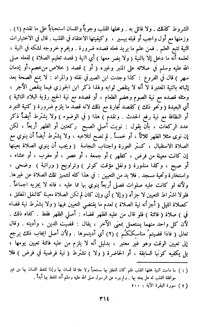 قَالَ فِي الْفُرُوعِ: كَذَا وَجَدْتُ ابْنَ الصَّيْرَفِيِّ نَقَلَهُ (وَالْمُرَادُ: لَا يَمْنَعُ الصِّحَّةَ بَعْدَ إثْبَاتِهِ بِالنِّيَّةِ الْمُعْتَبَرَةِ لَا أَنَّهُ لَا يَنْقُصُ ثَوَابُهُ، وَلِهَذَا ذَكَرَ ابْنُ الْجَوْزِيِّ فِيمَا يُنْقِصُ الْأَجْرَ وَمِثْلُهُ قَصْدُهُ مَعَ نِيَّةِ الصَّوْمِ هَضْمُ الطَّعَامِ، أَوْ قَصْدُهُ مَعَ نِيَّةِ الْحَجِّ رُؤْيَةُ الْبِلَادِ النَّائِيَةِ) أَيْ: الْبَعِيدَةِ (وَنَحْوُ ذَلِكَ) كَقَصْدِ تِجَارَةٍ مَعَ ذَلِكَ لِأَنَّهُ قَصَدَ مَا يَلْزَمُ ضَرُورَةً (كَنِيَّةِ التَّبَرُّدِ أَوْ النَّظَافَةِ مَعَ نِيَّةِ رَفْعِ الْحَدَثِ وَتَقَدَّمَ) هَذَا (فِي الْوُضُوءِ) وَلَا يُشْتَرَطُ أَيْضًا عَدَدُ الرَّكَعَاتِ، بِأَنْ يَقُولَ: نَوَيْتُ أُصَلِّي الصُّبْحَ رَكْعَتَيْنِ أَوْ الظُّهْرَ أَرْبَعًا لَكِنْ، إنْ نَوَى مَثَلًا الظُّهْرَ ثَلَاثًا، أَوْ خَمْسًا لَمْ تَصِحَّ لِتَلَاعُبِهِ، وَلَا يُشْتَرَطُ أَيْضًا أَنْ يَنْوِيَ مَعَ الصَّلَاةِ الِاسْتِقْبَالَ، كَسَتْرِ الْعَوْرَةِ وَاجْتِنَابِ النَّجَاسَةِ (وَيَجِبُ أَنْ يَنْوِيَ الصَّلَاةَ بِعَيْنِهَا إنْ كَانَتْ مُعَيَّنَةً مِنْ فَرْضٍ، كَظُهْرٍ) أَوْ جُمُعَةٍ أَوْ عَصْرٍ أَوْ مَغْرِبٍ أَوْ عِشَاءٍ أَوْ صُبْحٍ وَكَذَا مَنْذُورَةٍ (وَنَفْلٍ مُؤَقَّتٍ كَوِتْرٍ) وَتَرَاوِيحَ (وَرَاتِبَةٍ) وَضُحًى، وَاسْتِخَارَةٍ وَتَحِيَّةِ مَسْجِدٍ.