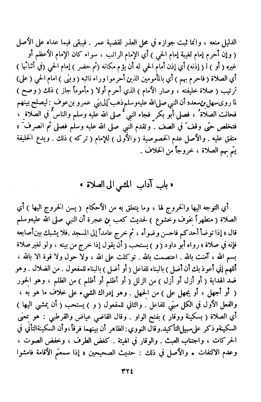 (بَابُ) (آدَابِ الْمَشْيِ إلَى الصَّلَاةِ) أَيْ: التَّوَجُّهِ إلَيْهَا وَالْخُرُوجِ لَهَا، وَمَا يَتَعَلَّقُ بِهِ مِنْ الْأَحْكَامِ (يُسْتَحَبُّ الْخُرُوجُ إلَيْهَا) أَيْ: الصَّلَاةِ (مُتَطَهِّرًا بِخَوْفٍ وَخُشُوعٍ) لِحَدِيثِ كَعْبِ بْنِ عُجْرَةَ أَنَّ النَّبِيَّ - صَلَّى اللَّهُ عَلَيْهِ وَسَلَّمَ - قَالَ «إذَا تَوَضَّأَ أَحَدُكُمْ فَأَحْسَنَ وُضُوءَهُ، ثُمَّ خَرَجَ عَامِدًا إلَى الْمَسْجِدِ فَلَا يُشَبِّكْ بَيْنَ أَصَابِعِهِ فَإِنَّهُ فِي صَلَاةٍ» رَوَاهُ أَبُو دَاوُد.