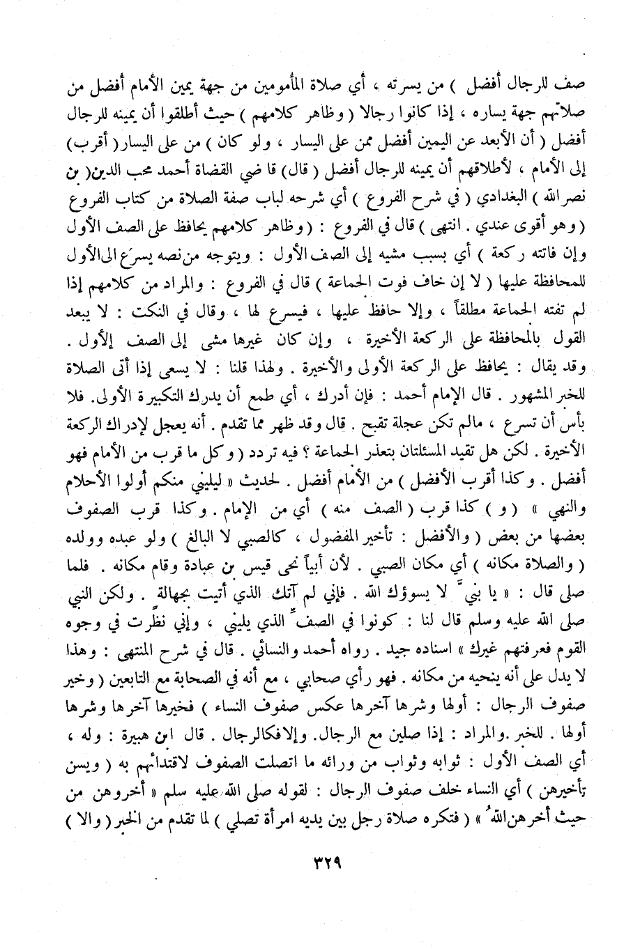 قَالَ فِي شَرْحِ الْمُنْتَهَى: وَهَذَا لَا يَدُلُّ عَلَى أَنَّهُ يُنَحِّيهِ مِنْ مَكَانِهِ فَهُوَ رَأْيُ صَحَابِيٍّ، مَعَ أَنَّهُ فِي الصَّحَابَةِ مَعَ التَّابِعِينَ (وَخَيْرُ صُفُوفِ الرِّجَالِ: أَوَّلُهَا وَشَرُّهَا آخِرُهَا عَكْسُ صُفُوفِ النِّسَاءِ) فَخَيْرُهَا آخِرُهَا وَشَرُّهَا أَوَّلُهَا لِلْخَبَرِ وَالْمُرَادُ: إذَا صَلَّيْنَ مَعَ الرِّجَالِ وَإِلَّا فَكَالرِّجَالِ قَالَ ابْنُ هُبَيْرَةَ وَلَهُ، أَيْ: الصَّفِّ الْأَوَّلِ: ثَوَابُهُ وَثَوَابُ مَنْ وَرَائِهِ مَا اتَّصَلَتْ الصُّفُوفُ لِاقْتِدَائِهِمْ بِهِ.