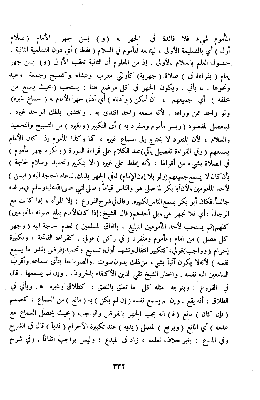 وَقَالَ فِي شَرْحِ الْفُرُوعِ: إلَّا الْمَرْأَةَ إذَا كَانَتْ مَعَ الرِّجَالِ، أَيْ: فَلَا تَجْهَرْ هِيَ، بَلْ أَحَدُهُمْ (قَالَ الشَّيْخُ: إذَا كَانَ الْإِمَامُ يَبْلُغُ صَوْتُهُ الْمَأْمُومِينَ) كُلَّهُمْ (لَمْ يُسْتَحَبَّ لِأَحَدِ الْمَأْمُومِينَ التَّبْلِيغُ، بِاتِّفَاقِ الْمُسْلِمِينَ) لِعَدَمِ الْحَاجَةِ إلَيْهِ (وَجَهْرُ كُلِّ مُصَلٍّ) مِنْ إمَامٍ وَمَأْمُومٍ وَمُنْفَرِدٍ (فِي رُكْنٍ) قَوْلِي، كَقِرَاءَةِ الْفَاتِحَةِ، وَتَكْبِيرَةِ إحْرَامٍ (وَوَاجِبٍ) قَوْلِي، كَتَكْبِيرِ انْتِقَالٍ وَتَشَهُّدٍ أَوَّلٍ وَتَسْمِيعٍ وَتَحْمِيدٍ (فَرْضٌ بِقَدْرِ مَا يُسْمِعُ نَفْسَهُ) لِأَنَّهُ لَا يَكُونُ أَتَيَا بِشَيْءٍ مِنْ ذَلِكَ بِدُونِ صَوْتٍ وَالصَّوْتُ مَا يَتَأَتَّى سَمَاعُهُ وَأَقْرَبُ السَّامِعِينَ إلَيْهِ نَفْسُهُ، وَاخْتَارَ الشَّيْخُ تَقِيُّ الدِّينِ الِاكْتِفَاءَ بِالْحُرُوفِ، وَإِنْ لَمْ يَسْمَعْهَا قَالَ فِي الْفُرُوعِ: وَيَتَوَجَّهُ مِثْلَهُ كُلُّ مَا تَعَلَّقَ بِالنُّطْقِ، كَطَلَاقٍ وَغَيْرِهِ اهـ.