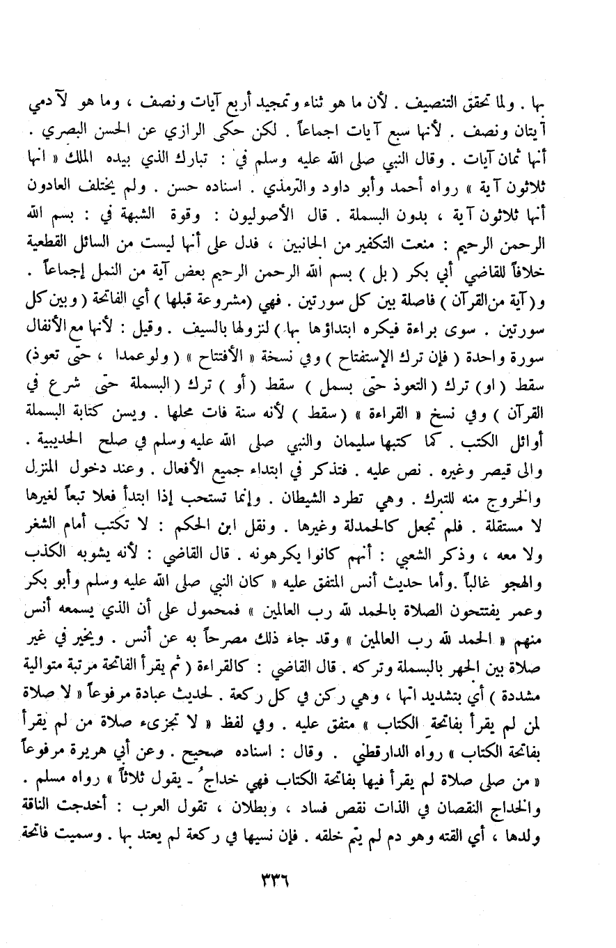 قَالَ الْأُصُولِيُّونَ: وَقُوَّةُ الشُّبْهَةِ فِي: بِسْمِ اللَّهِ الرَّحْمَنِ الرَّحِيمِ: مَنَعَتْ التَّكْفِيرَ مِنْ الْجَانِبَيْنِ، فَدَلَّ عَلَى أَنَّهَا لَيْسَتْ مِنْ الْمَسَائِلِ الْقَطْعِيَّةِ خِلَافًا لِلْقَاضِي أَبِي بَكْرٍ (بَلْ) {بِسْمِ اللَّهِ الرَّحْمَنِ الرَّحِيمِ} [الفاتحة: ١] بَعْضُ آيَةٍ مِنْ النَّمْلِ إجْمَاعًا.