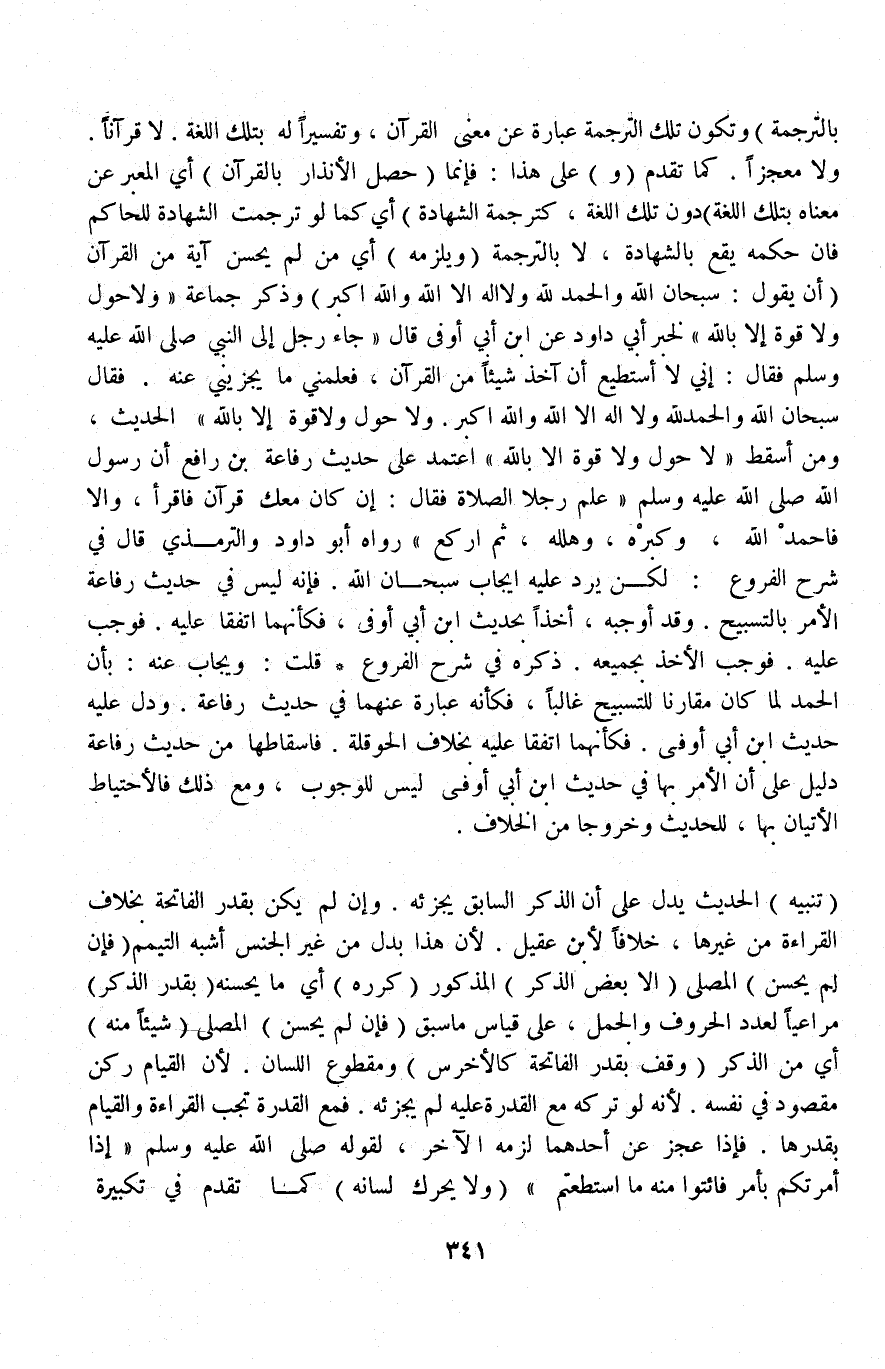 بِالتَّرْجَمَةِ) وَتَكُونُ تِلْكَ التَّرْجَمَةُ عِبَارَةً عَنْ مَعْنَى الْقُرْآنِ، وَتَفْسِيرًا لَهُ بِتِلْكَ اللُّغَةِ لَا قُرْآنًا وَلَا مُعْجِزًا، كَمَا تَقَدَّمَ (وَ) عَلَى هَذَا: فَإِنَّمَا (حَصَلَ الْإِنْذَارُ بِالْقُرْآنِ) أَيْ: الْمُعَبَّرُ عَنْ مَعْنَاهُ بِتِلْكَ اللُّغَةِ (دُونَ تِلْكَ اللُّغَةِ، كَتَرْجَمَةِ الشَّهَادَةِ) أَيْ: كَمَا لَوْ تُرْجِمَتْ الشَّهَادَةُ لِلْحَاكِمِ فَإِنَّ حُكْمَهُ يَقَعُ بِالشَّهَادَةِ، لَا بِالتَّرْجَمَةِ.